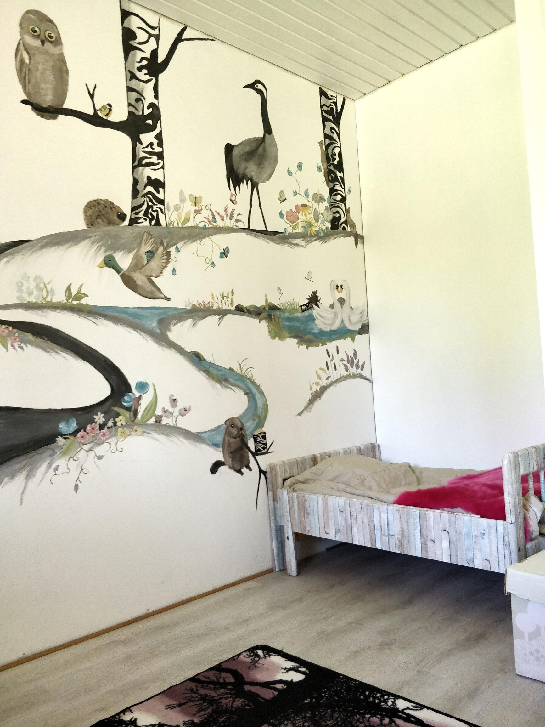 "Olin aina haaveillut kokonaisen seinän maalaamisesta. Lopullinen ajatus lähti kuitenkin siitä, että kaupoista ei löytynyt sopivaa tapettia huoneeseen. Halusin jotain luontoon liittyvää, mutta kaikki tapetit tuntuivat tylsiltä ja mielikuvituksettomilta. "