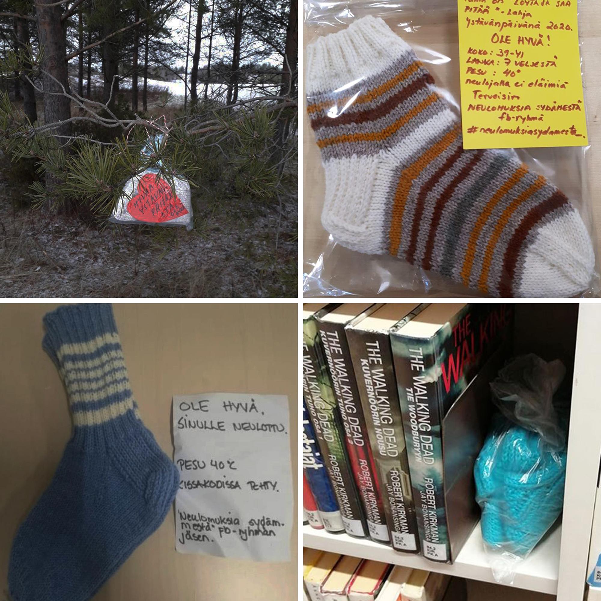 Kuopiossa ja muutamalla muullakin paikkakunnalla levisi viime viikolla hauska ilmiö, kun ihmiset löysivät villasukkapareja puistonpenkiltä, kirjaston palautusluukusta tai taloyhtiön ilmoitustaululta.