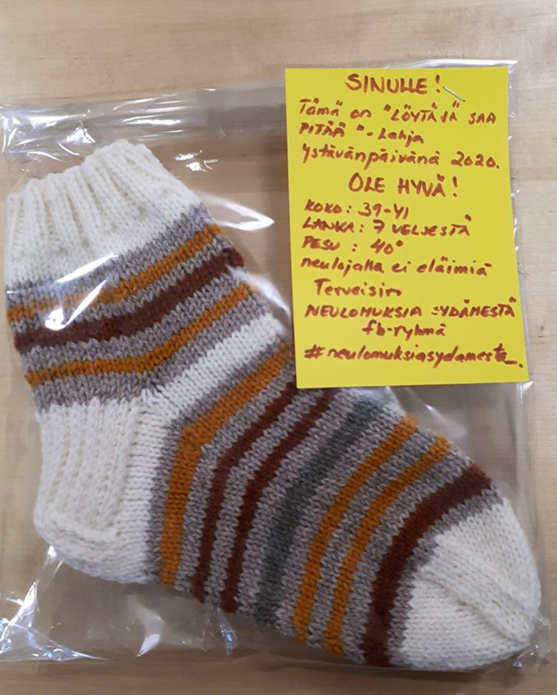 Harmaa työaamu kääntyi hippusen verran valoisammaksi, kun kuopiolaisen Mira Vilokkisen silmiin osui bussipysäkin penkillä nököttävä Minigrip-pussi. Pussissa olivat sympaattiset raidalliset villasukat ja sukkien mukana lappu: Ole hyvä, sinulle neulottu.
