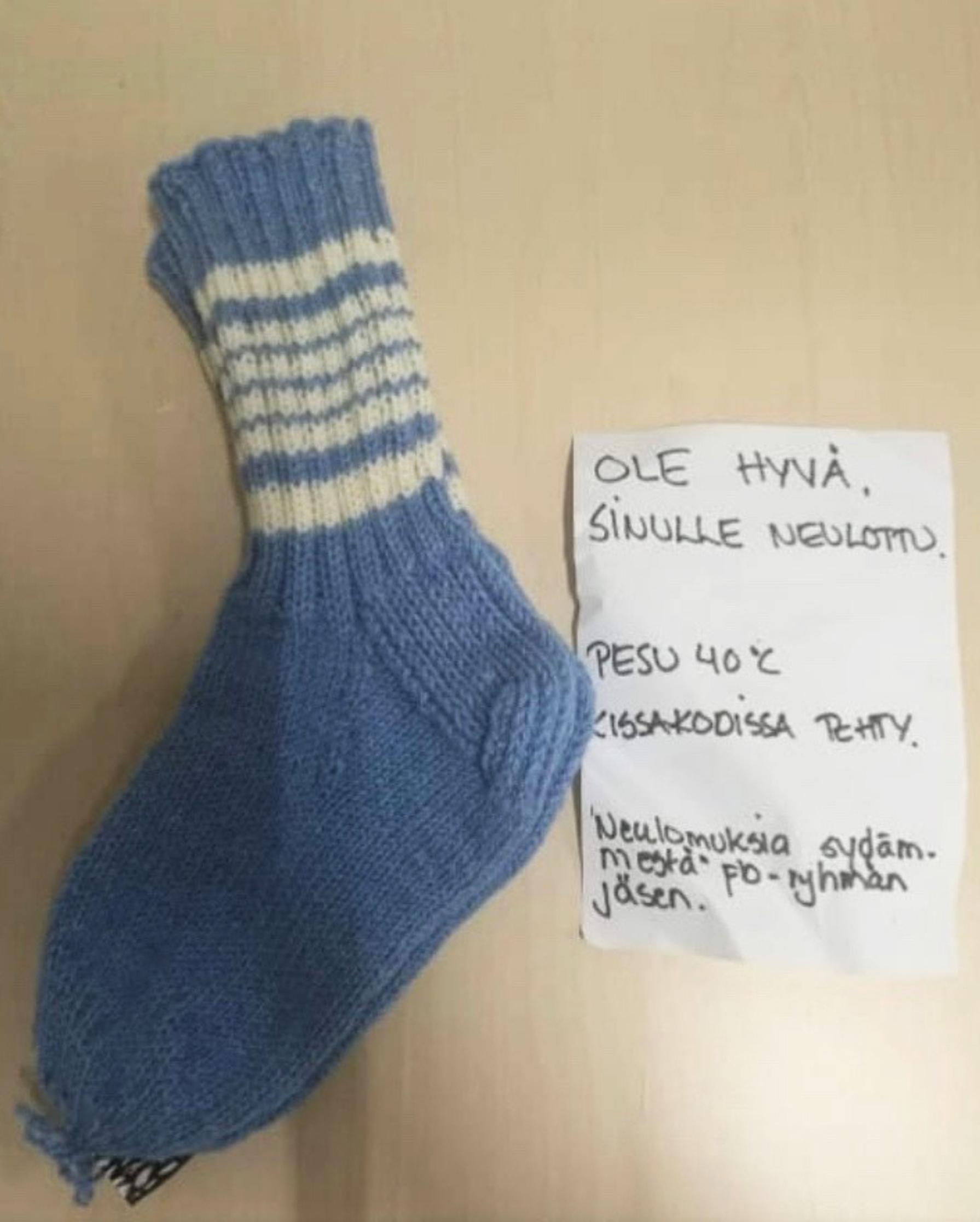 – Ihmiset haluavat tehdä hyvää. Lisäksi moni aktiivinen neuloja ei tiedä, mihin laittaisi sukkia, kun niitä valmistuu niin paljon. Samaan aikaan on paljon ihmisiä, jotka ottaisivat mielellään sukkia vastaan, Mertanen kertoo.