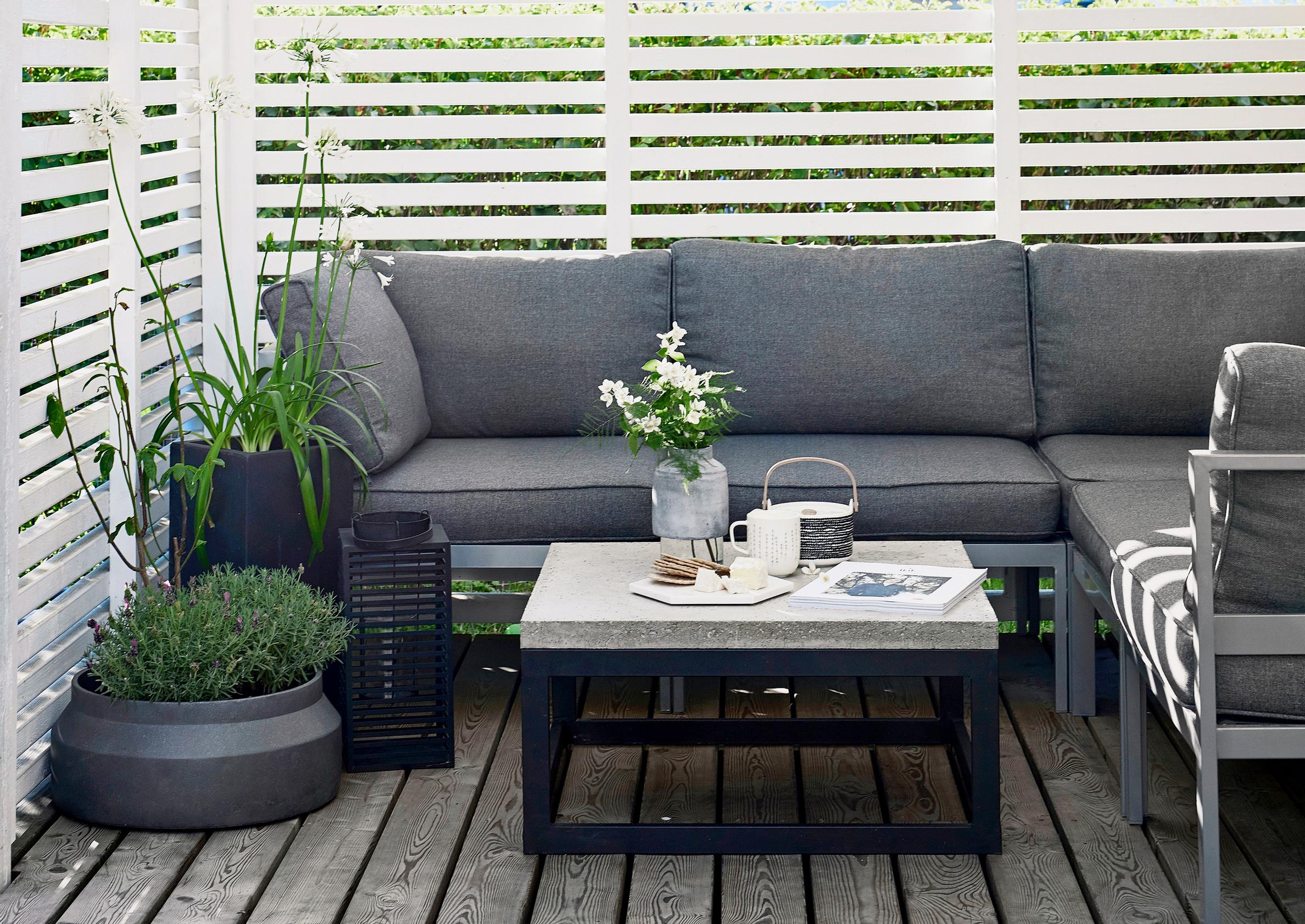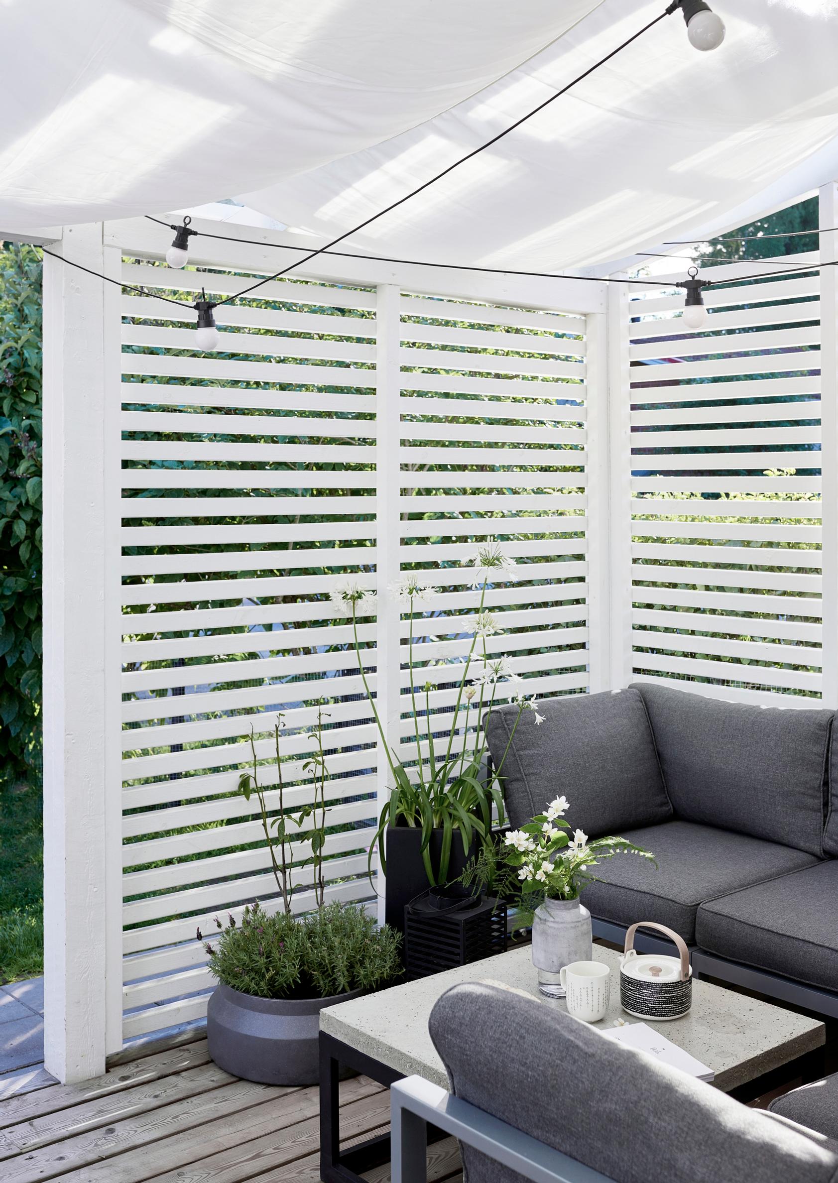 Perusterassista tulee pienellä vaivalla tunnelmallinen kesäolohuone. Kevyt rimaseinä antaa suojaa katseilta ja purjekangas auringolta.
