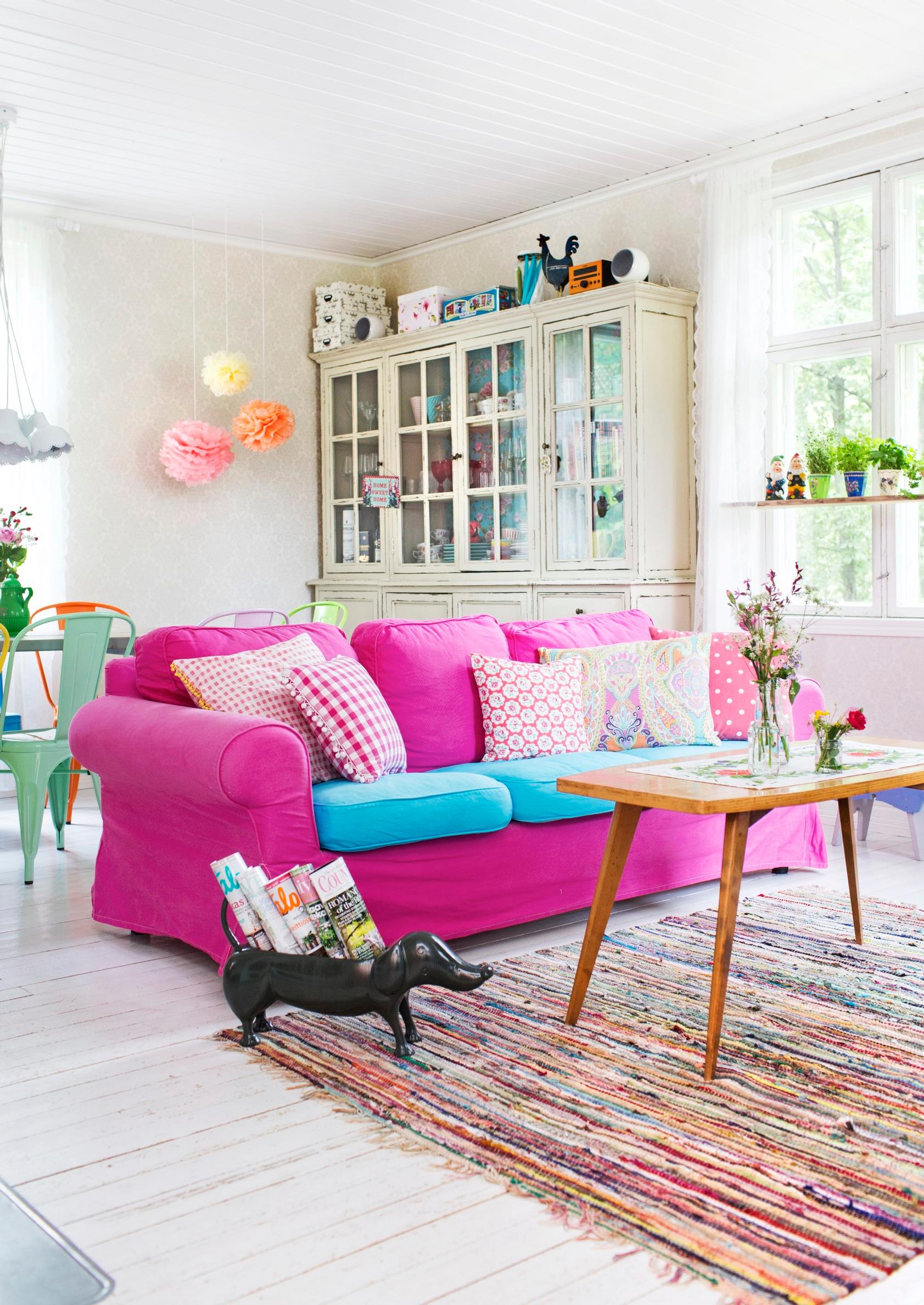 Ektorpiin saa monenlaisia irtopäällisiä, mutta valkoiset päälliset voi värjätä myös itse pesukoneessa. Pinkki ja vaaleansininen sohva on iloisen värikkään sisustuksen tähtikaluste!
