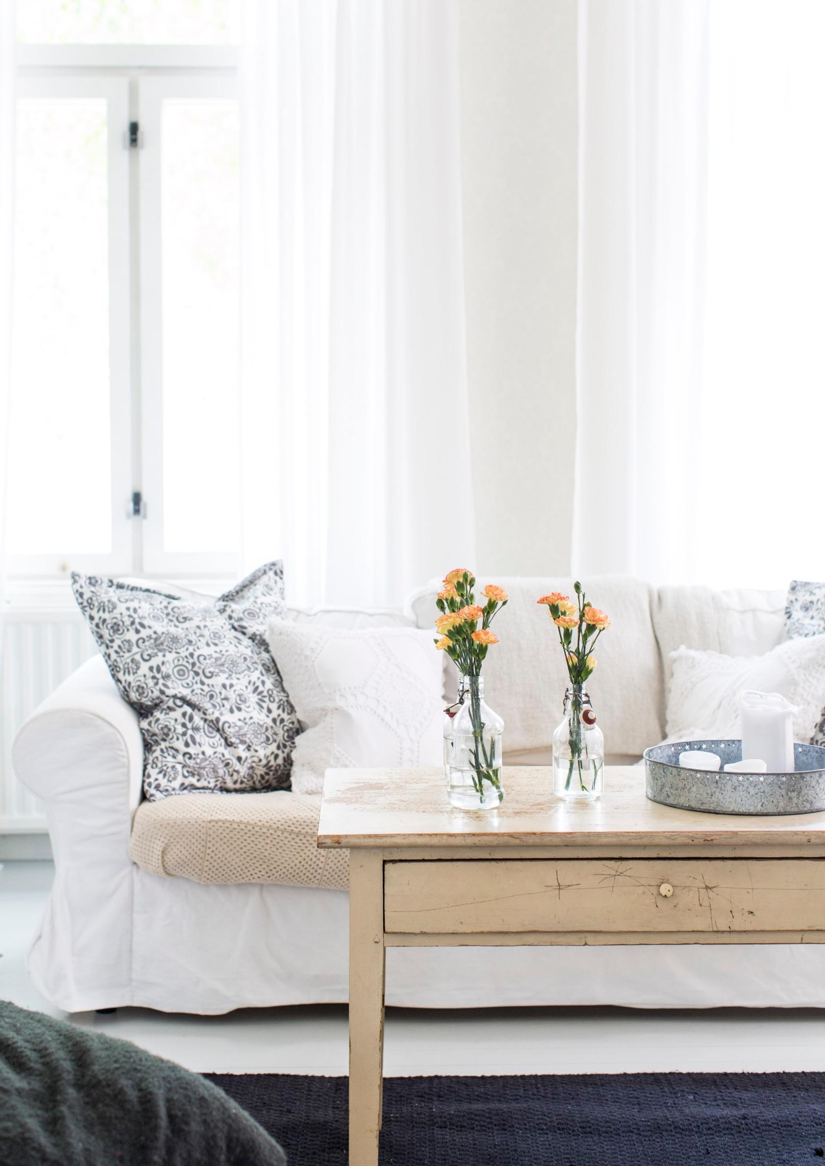 Onko tyylisi pelkistetty ja skandinaavisen eteerinen? Sinunkin kannattaa tutustua selkeälinjaiseen Ektorpiin. Jos haluat sohvaan hieman lisää juurevuutta, peitä istuinosa viljan värisellä viltillä ja työnnä sen helmat istuintyynyjen alle.