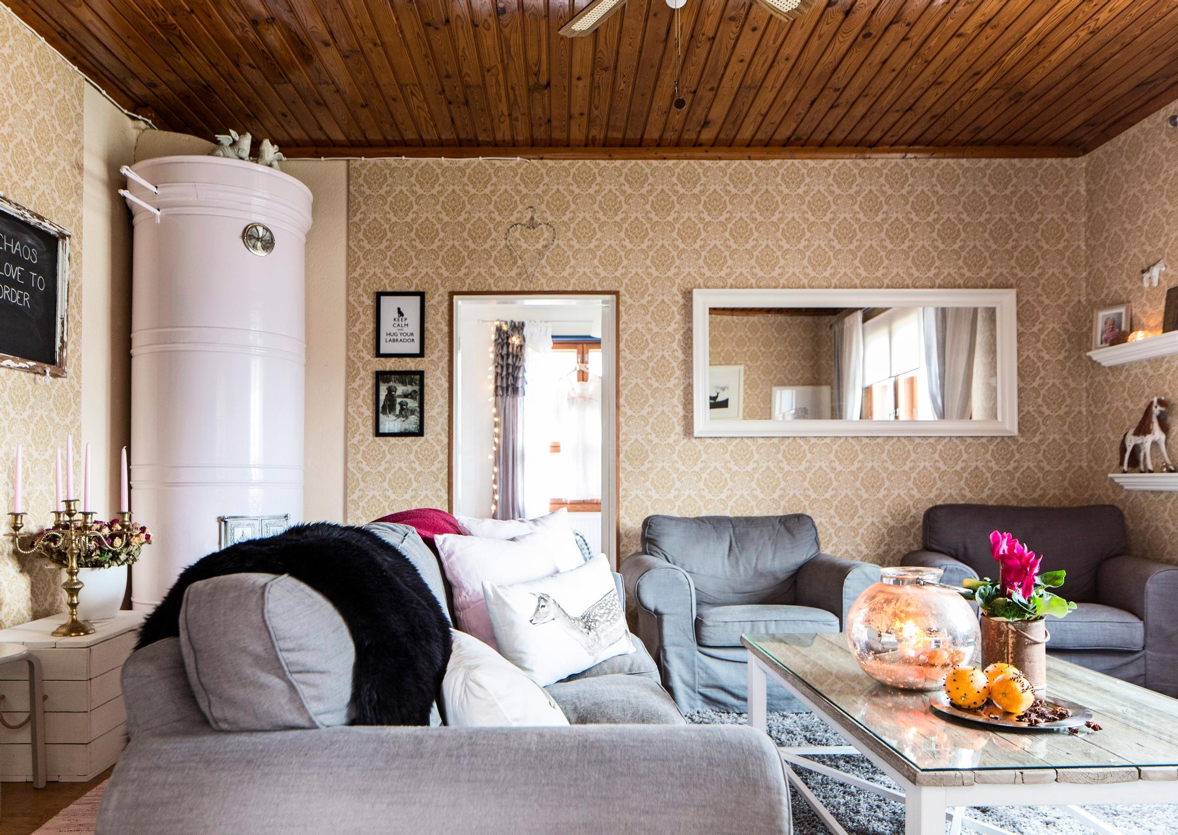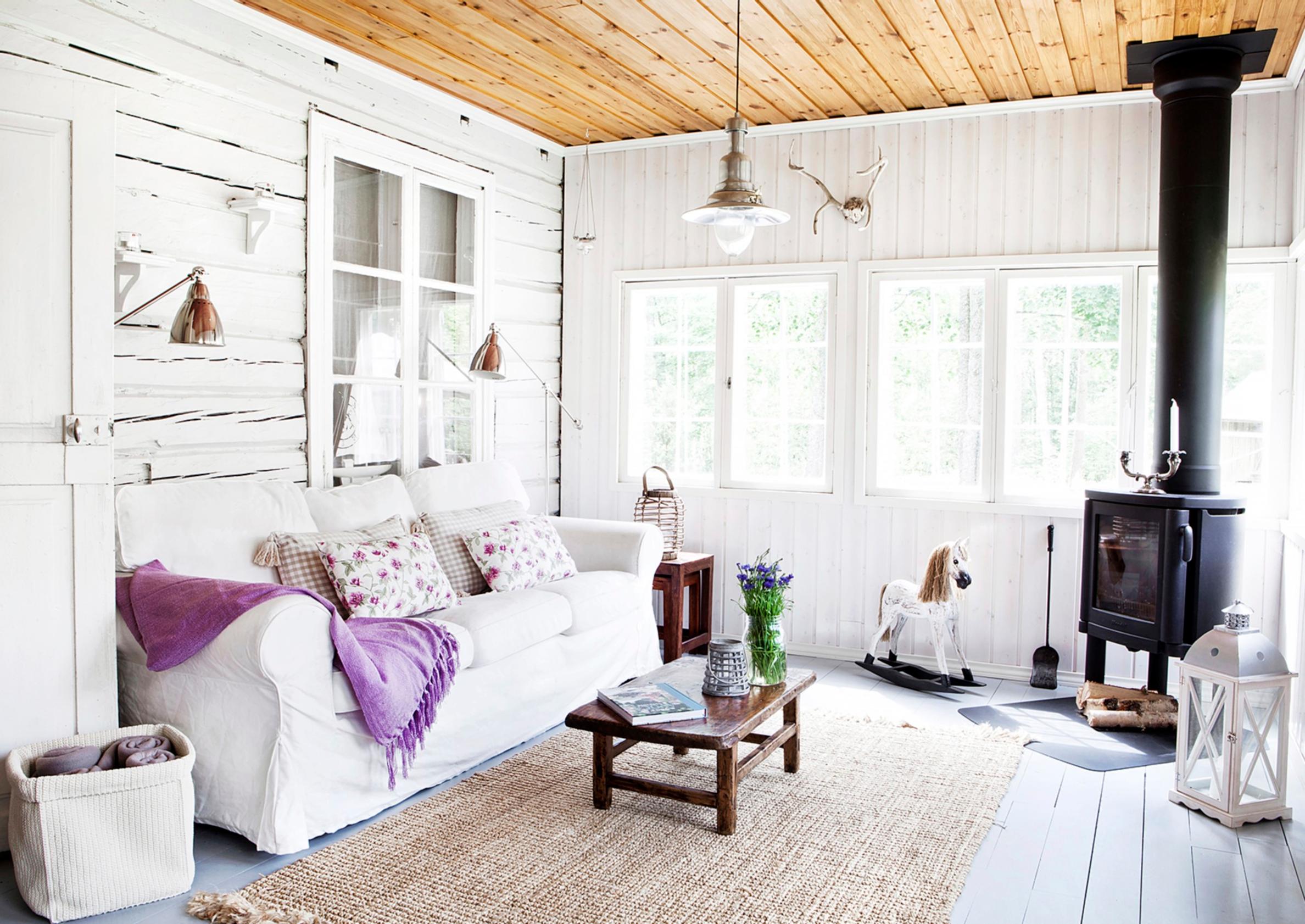 Huvilatyyliin kuuluu tietysti valkoinen Ektorp! Se on hieno vastakohta mustalle kamiinalle ja rustiikille sohvapöydälle. Muutama vaaleansininen yksityskohta täydentää kokonaisuuden.