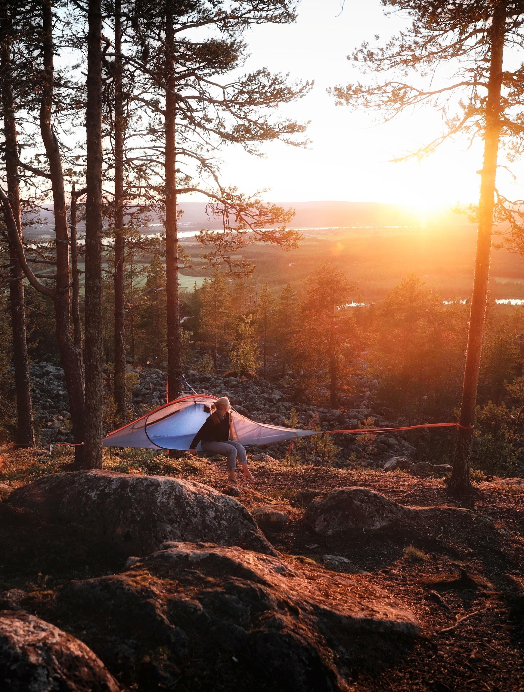 - + Riippumatto. ”Vakiovarusteemme on kevyt, laskuvarjokankaasta tehty riippumatto. Sen saa pieneen tilaan ja sen heijaukseen on ihana nukahtaa päiväunille. On kätevää, että nuorin lapsi pystyy nukkuman päiväunet missä vain sillä aikaa, kun muut leikkivät.”
