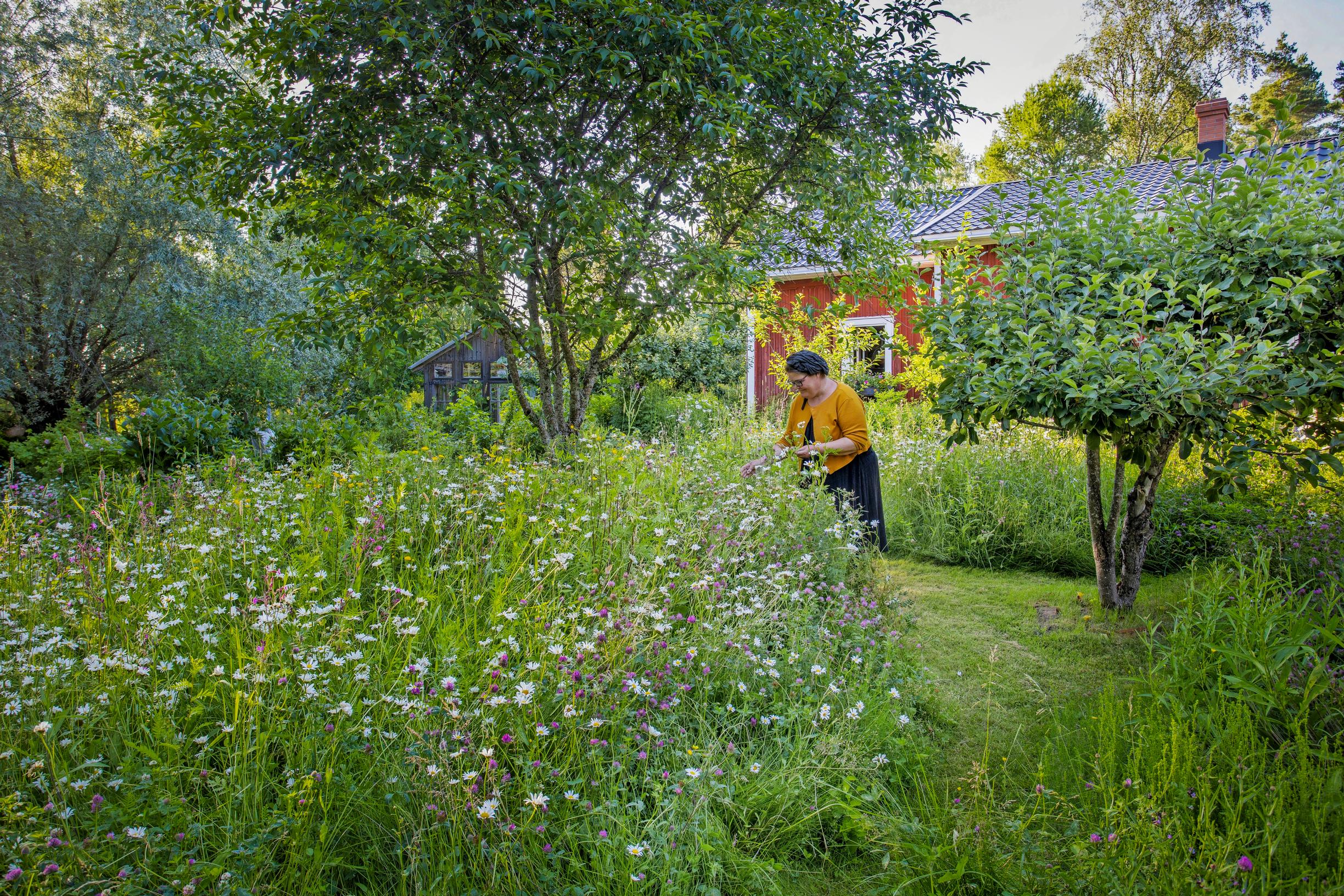 Maikki perusti pihansa niittyalueet no dig -menetelmällä eli maata kaivamatta. Hän pitää kahden niittyalueensa villistä ilmeestä, mutta kitkee silti niiltä ei-toivotut kasvit
