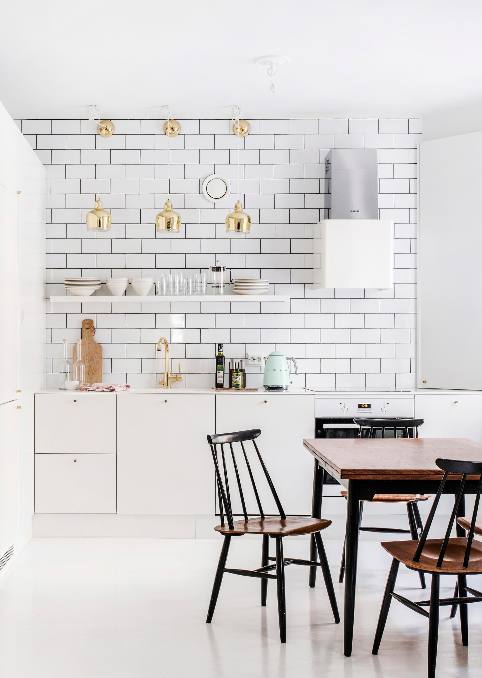Valaistus integroidaan usein yläkaappeihin. Kun yläkaappeja ei ole, valitse seinävalaisimet, jotka ovat kohdistettavissa. Kätevintä on, jos ne voi suunnata nivelen avulla. Myös sirot riippuvalaisimet nousevat kauniisti esiin tyhjää seinäpintaa vasten. Sijoita valaistus tarkasti: ota huomioon tilan korkeus, käyttäjän pituus ja se, onko seinässä hyllyjä, jotka estävät valon kulkua. Muista myös miettiä pistorasioiden paikat. Jos ne asennetaan seinään ja jäävät näkyviin, valitse muuhun tyyliin sopivat. Valittavana on myös pöytätasoihin upotettavia malleja.