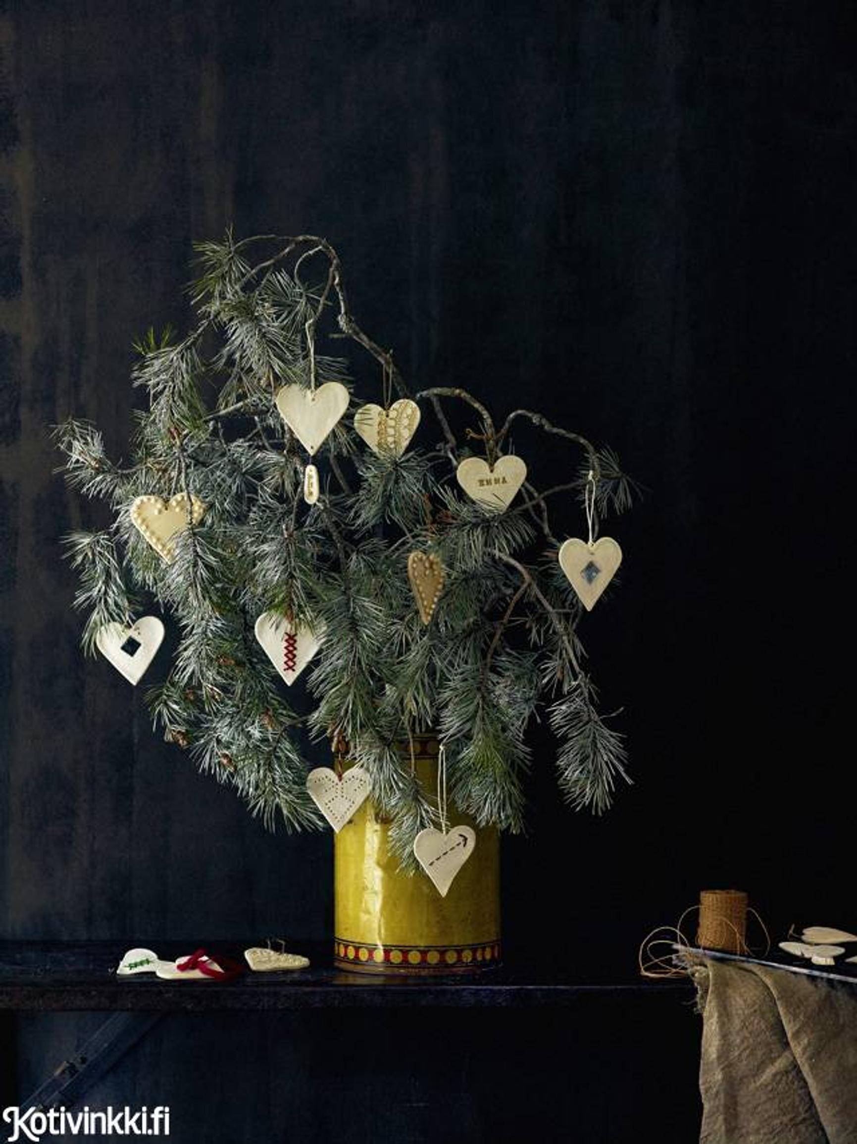 Ripusta sydämet kotiasi koristamaan tai paketoi ystävälle lahjaksi. Kuvan männynoksat spraymaalattiin talvisen huurteisiksi.