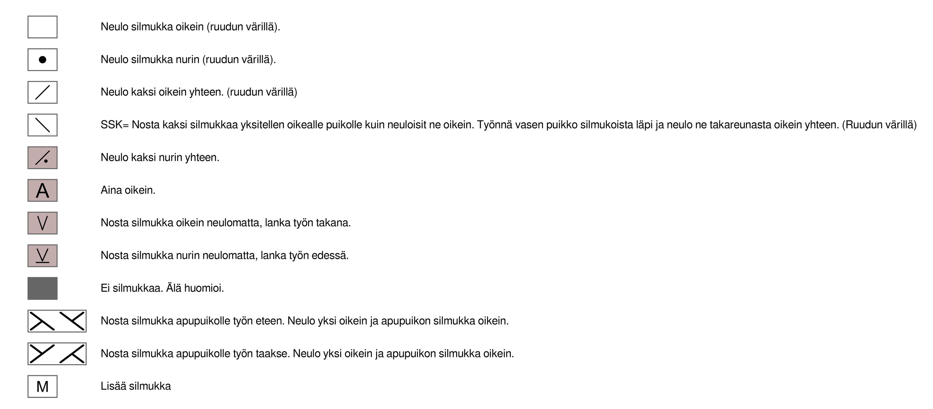 1. krs. (oikea puoli): 2 oikein, *nosta 1 silmukka neulomatta, 1 oikein*. Toista *-*, kunnes jäljellä on 2 silmukkaa. Neulo kaksi viimeistä silmukkaa oikein. Käännä työ.