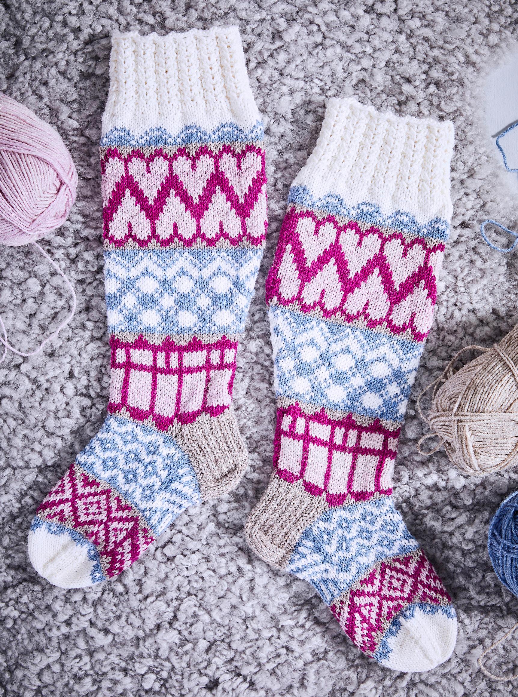 Sydämiä ja huurteisia pastellisävyjä! Mia Sumellin kimaltavat kirjoneulesukat ovat kuin suloisesta talvisadusta