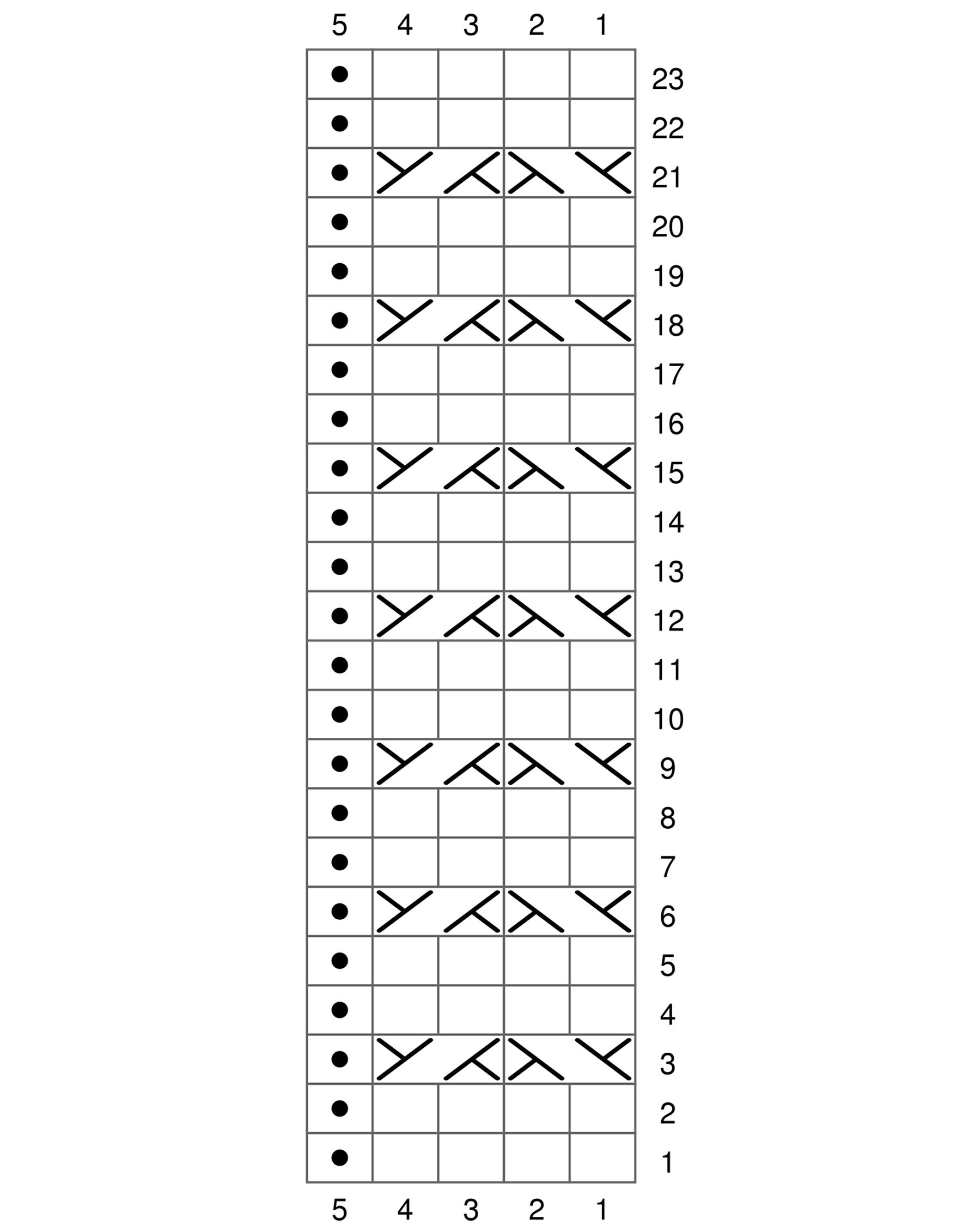 1. ja 3 puikon lopussa: Neulo kolmanneksi ja toiseksi viimeiset silmukat oikein yhteen. Neulo viimeinen silmukka oikein.