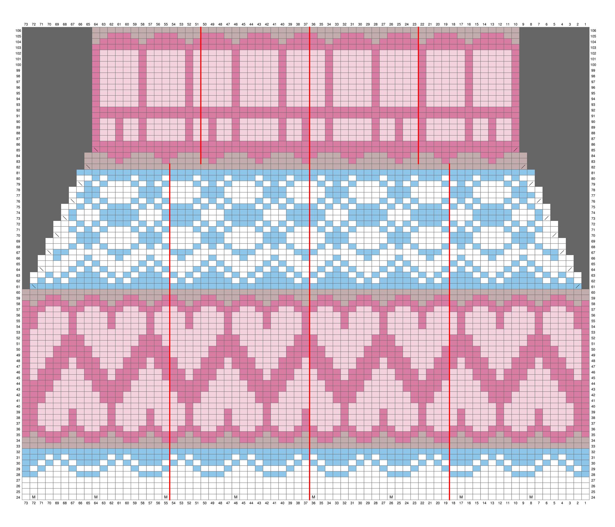 Neulo kaavio 2. Huomaa lisäykset ensimmäisellä kerroksella. Jaa silmukat 18/18/18/19. Jaa silmukat uudelleen kerroksella 83: 13/14/14/14.