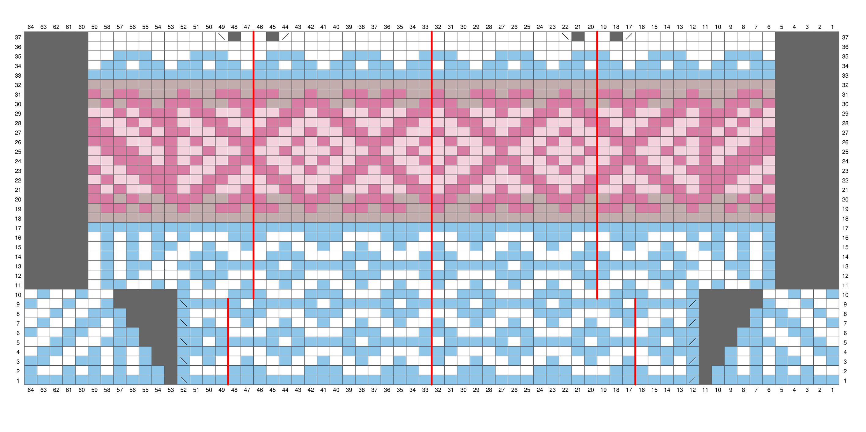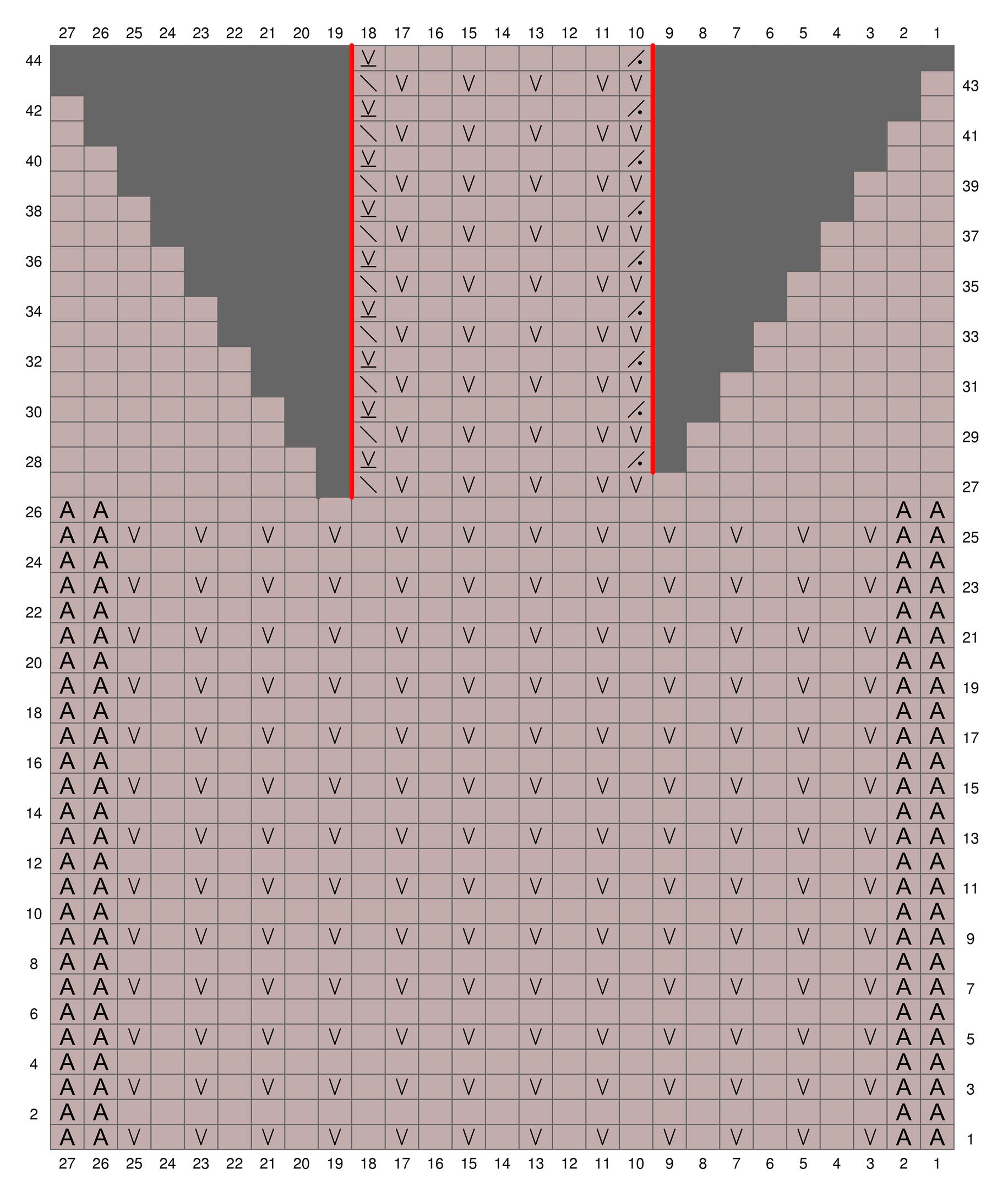 Neulo kaavio 3. Kantapään kaavio neulotaan tasona. Kääntymiskohta on merkitty punaisella pystyviivalla.