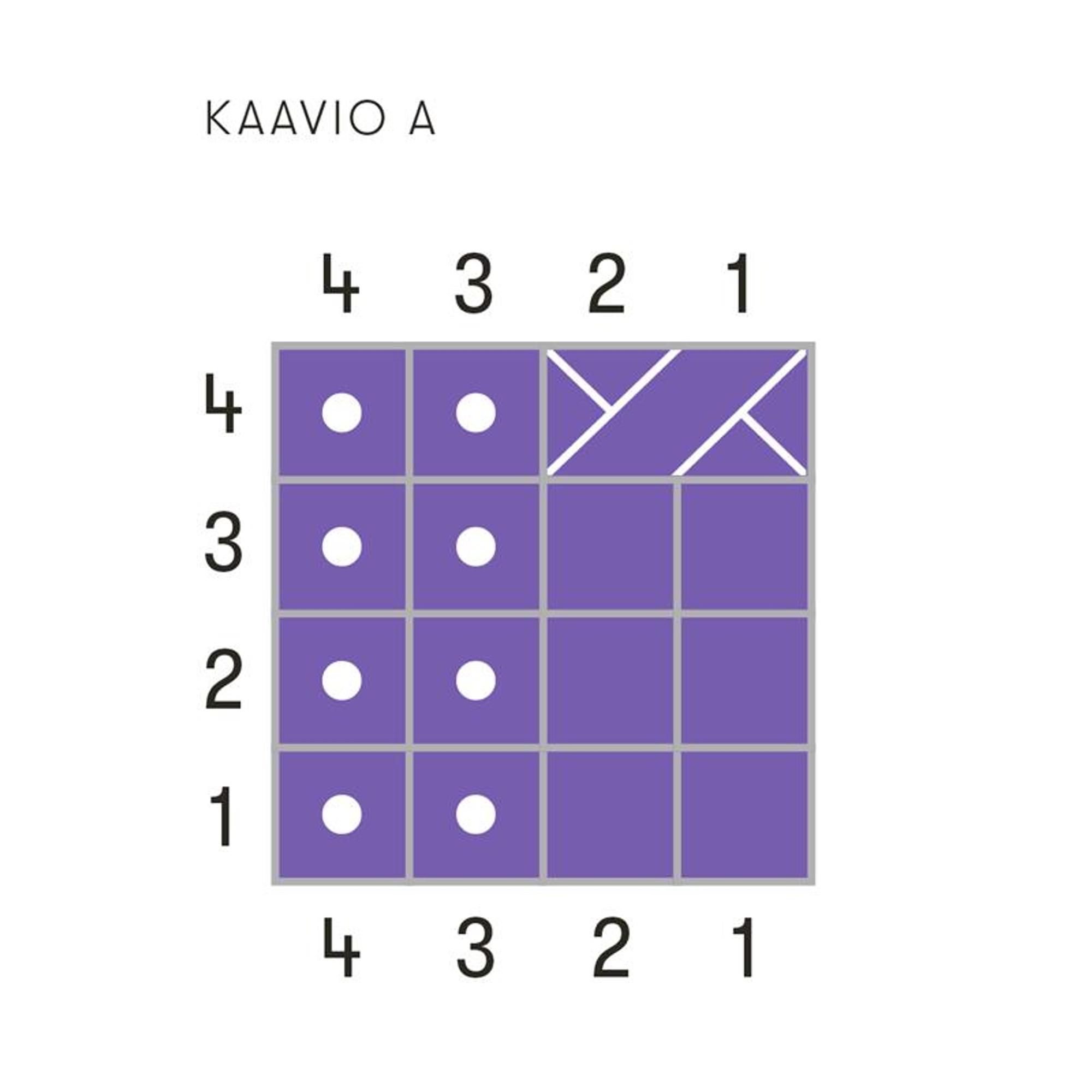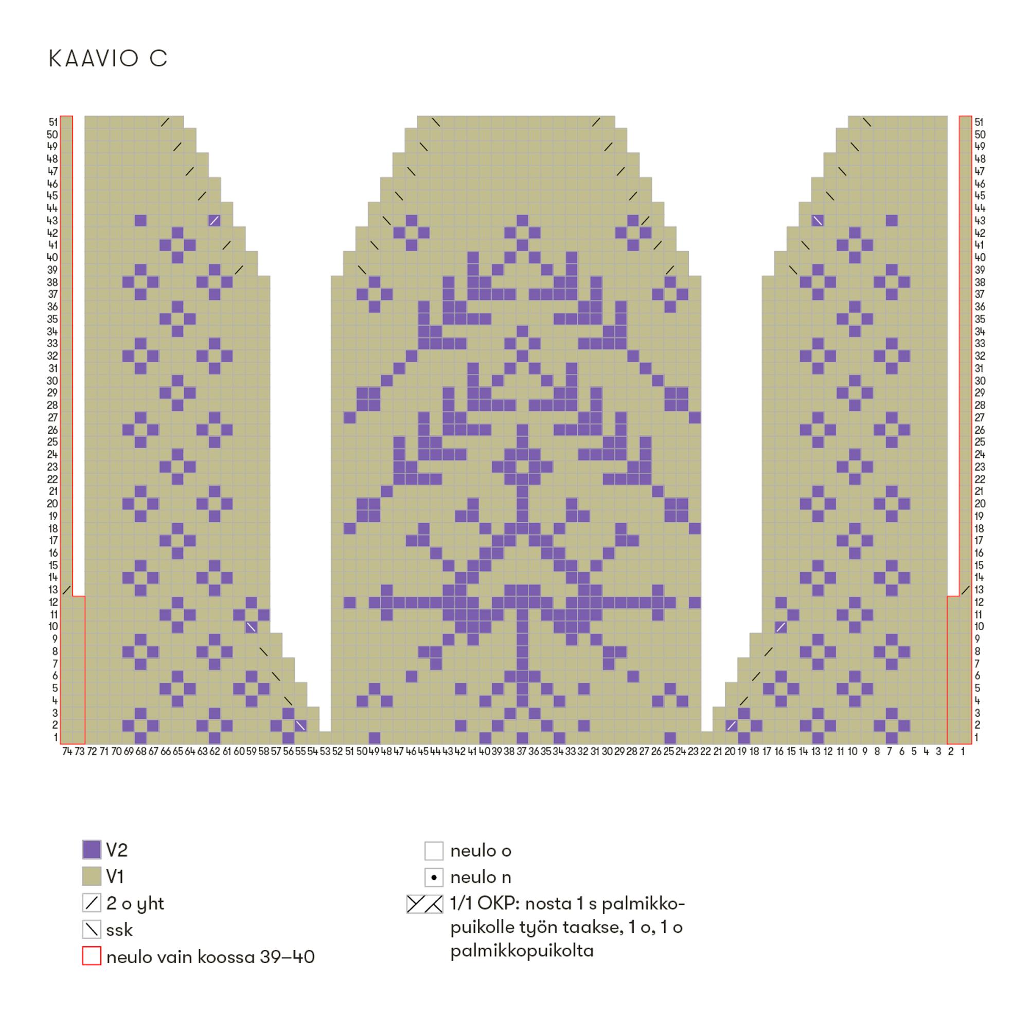Jatka kirjoneuleen neulomista kaavion C mukaan. Tee kaavioon merkityt kavennukset krs:lla 39–51. Kärkikavennusten jälkeen työssä on 32 (34) s. Tee sen jälkeen vielä kavennuskrs neulomalla 2 o yht krs:n loppuun. Puikoilla on 16 (18) s. Vedä lanka puikoilla olevien silmukoiden läpi, kiristä hyvin ja päättele. Neulo toinen sukka samoin.