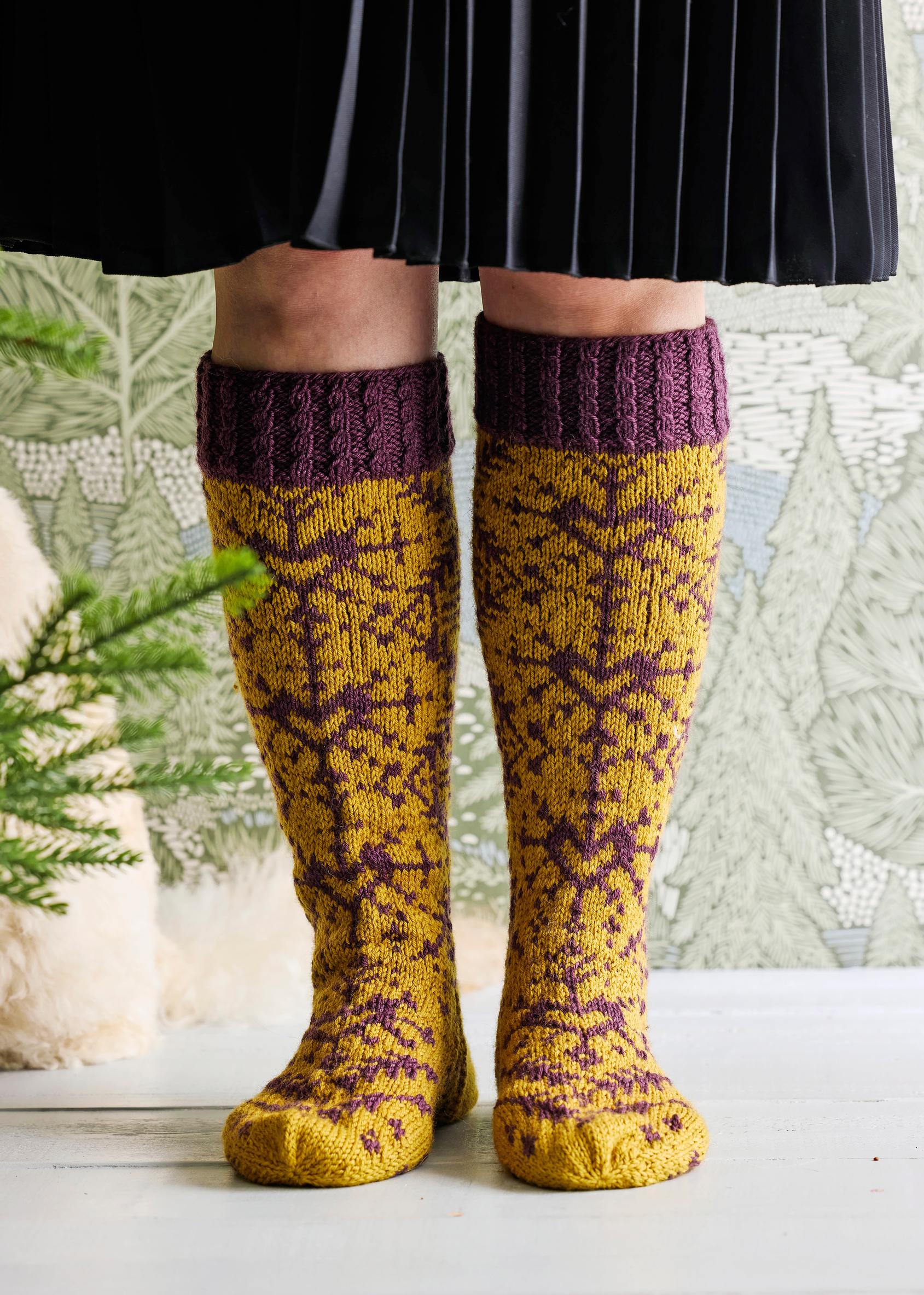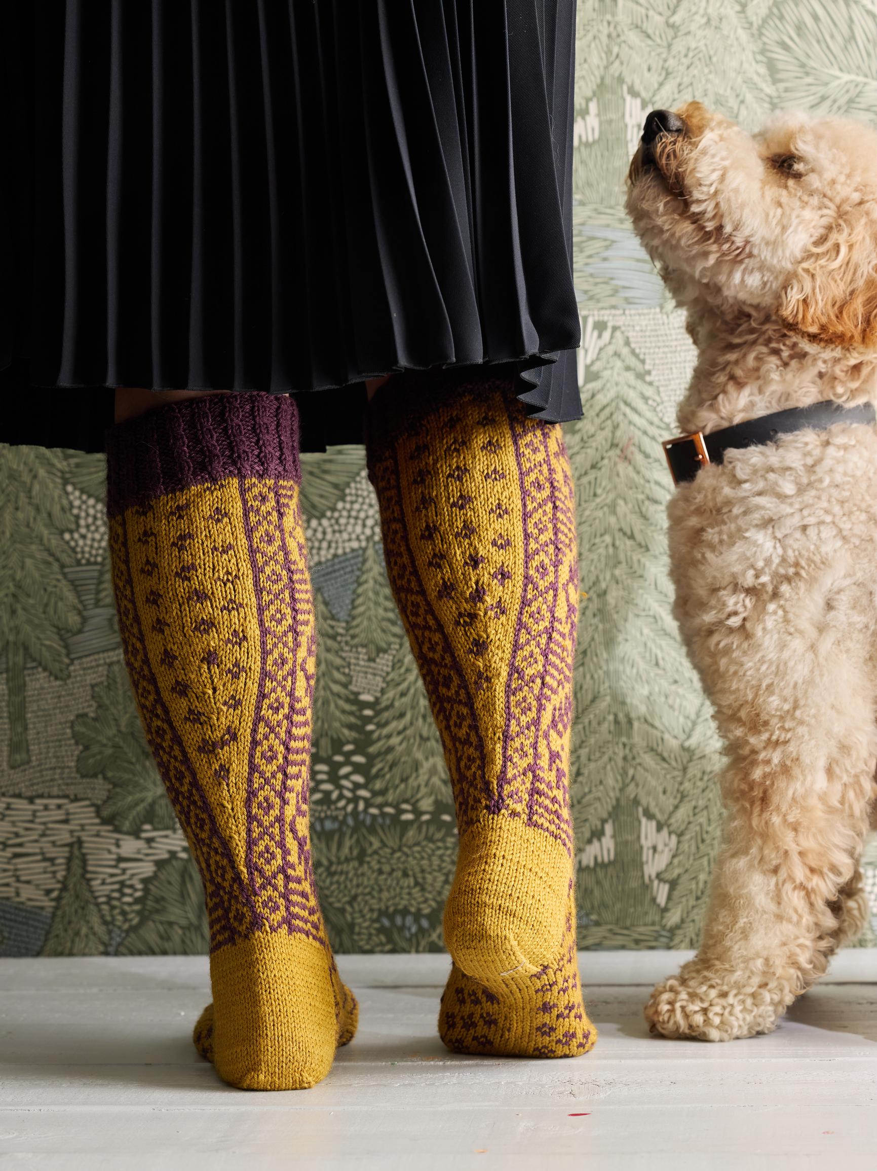 Jenna Kostetin suunnittelemat pitkävartiset kirjoneulesukat ovat saaneet inspiraationsa perinnekuvioista. Käsinvärjätyssä sukkalangassa on hehkuvat värit.