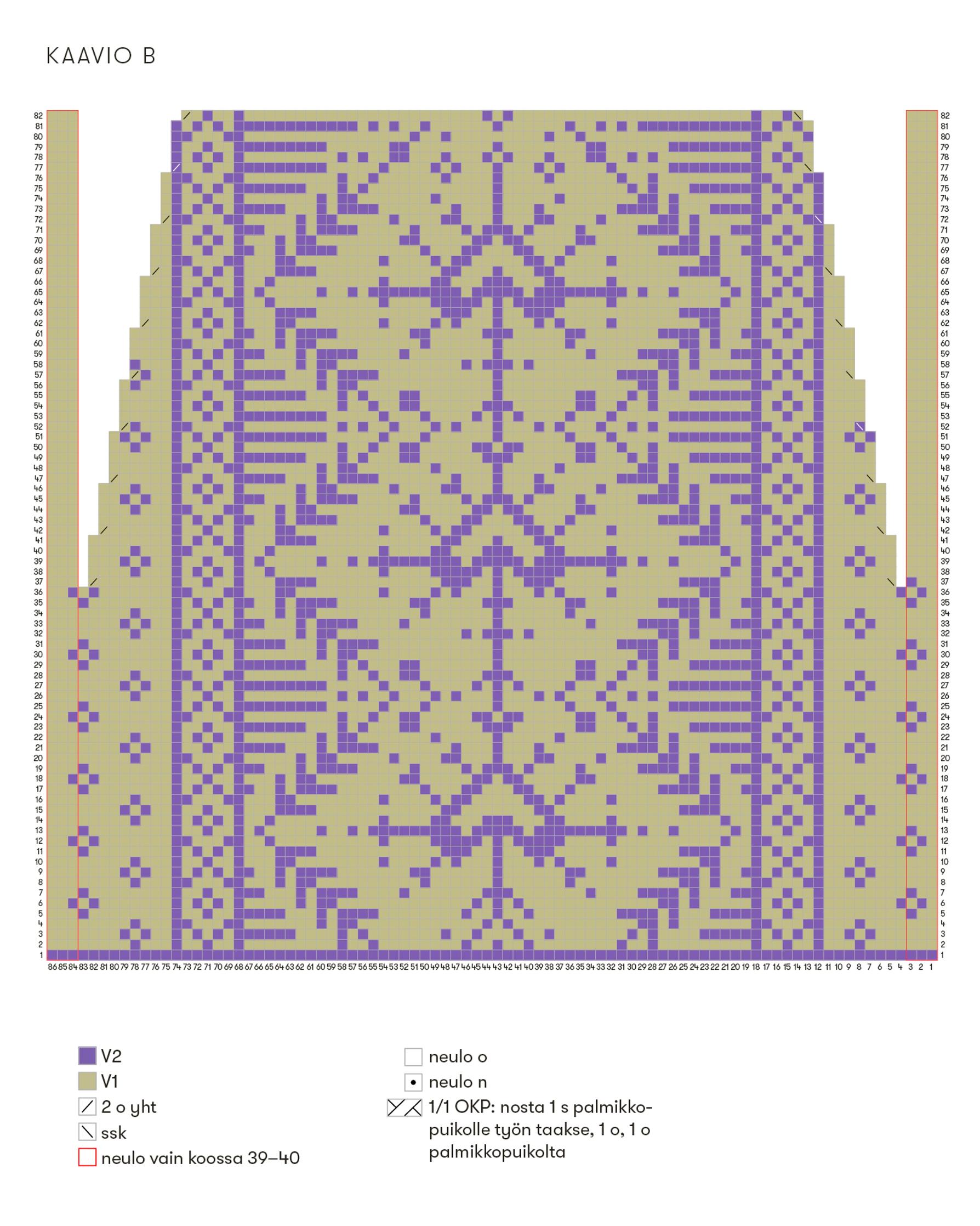 Vaihda työhön paksummat puikot. Jaa s:t neljälle puikolle seuraavasti 25–15–15–25 (28–15–15–28) s. Ota V1 mukaan ja aloita kirjoneuleen neulominen kaavio B:stä. Tee kavennukset kaaviossa merkittyihin kohtiin. Kavennusten jälkeen varressa on 60 (66) s.