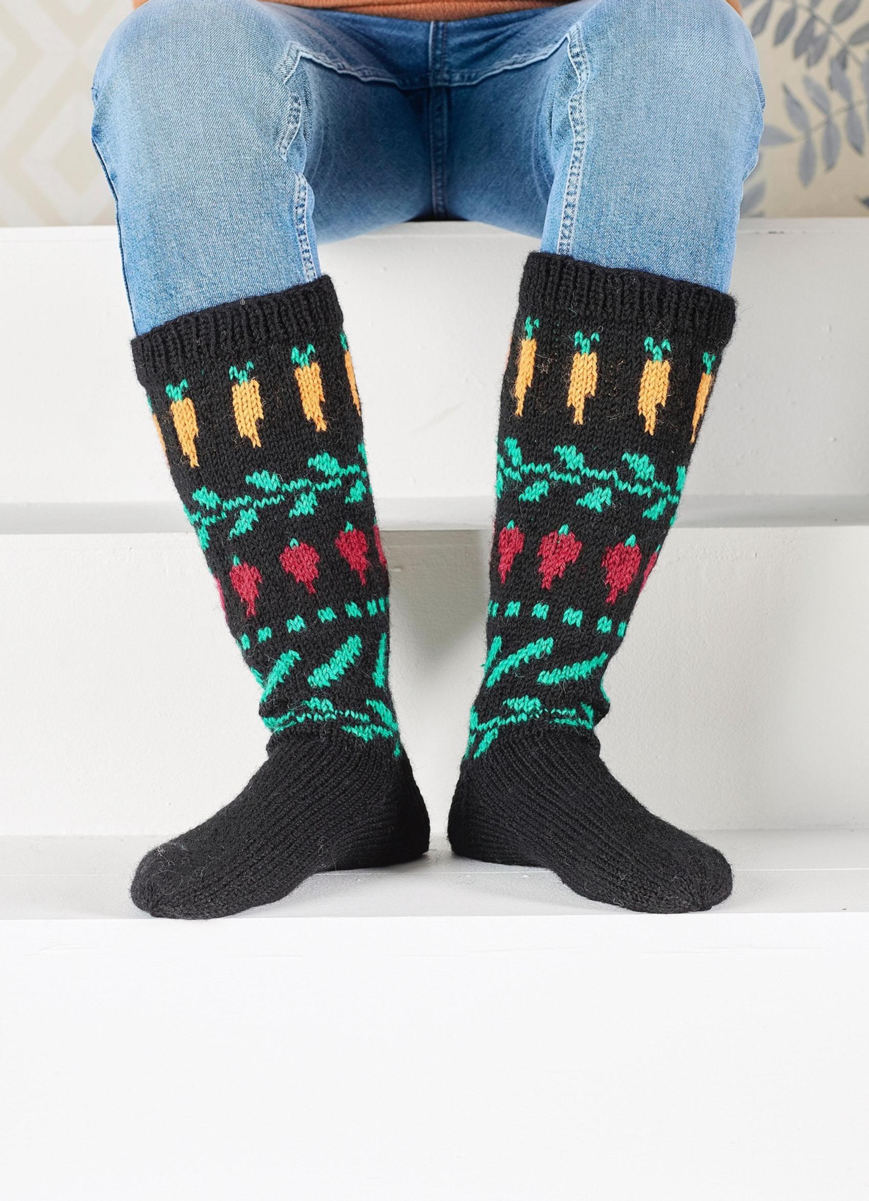 Nämä pitkävartiset sukat juhlistavat kasvun ihmettä. Porkkanat, punajuuret ja herneenpalot limittyvät sulassa sovussa sukan varsiin. Sukkien teräosa on selkeän yksivärinen. Nappaa Puutarhurin sukkien ohje ja neulo sukat itselle tai viherpeukaloystävälle!