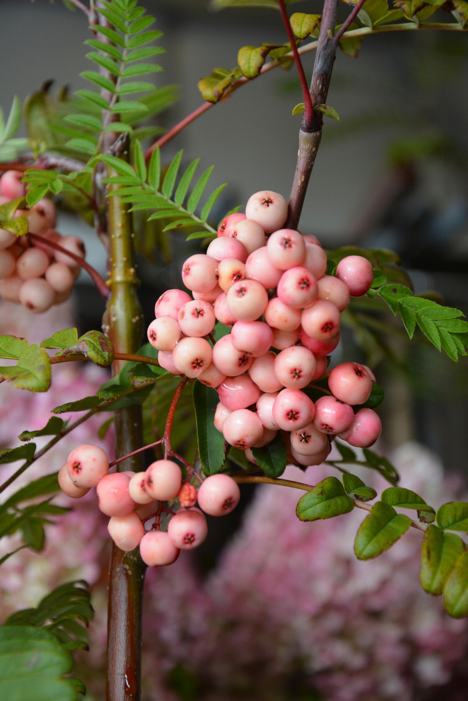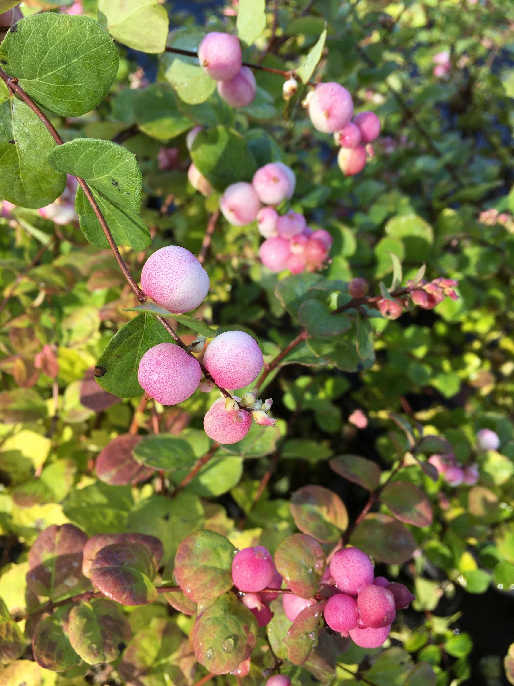 Symphoricarpos ’Mother of Pearl’ hurmaa vaaleanpunaisilla marjoillaan, jotka ovat kuin karkkeja. Pysty- ja tuuheakasvuisen, hyvin vähään tyytyväisen hollanninlumimarjan sirot oksat kaartuvat kauniisti. Olen nähnyt pensasta kasvamassa muurin päällä, josta oksat valuivat vapaasti alas. Versoja voi käyttää leikkokimpuissakin ja maljakossa. Marjat ovat lievästi myrkylliset.