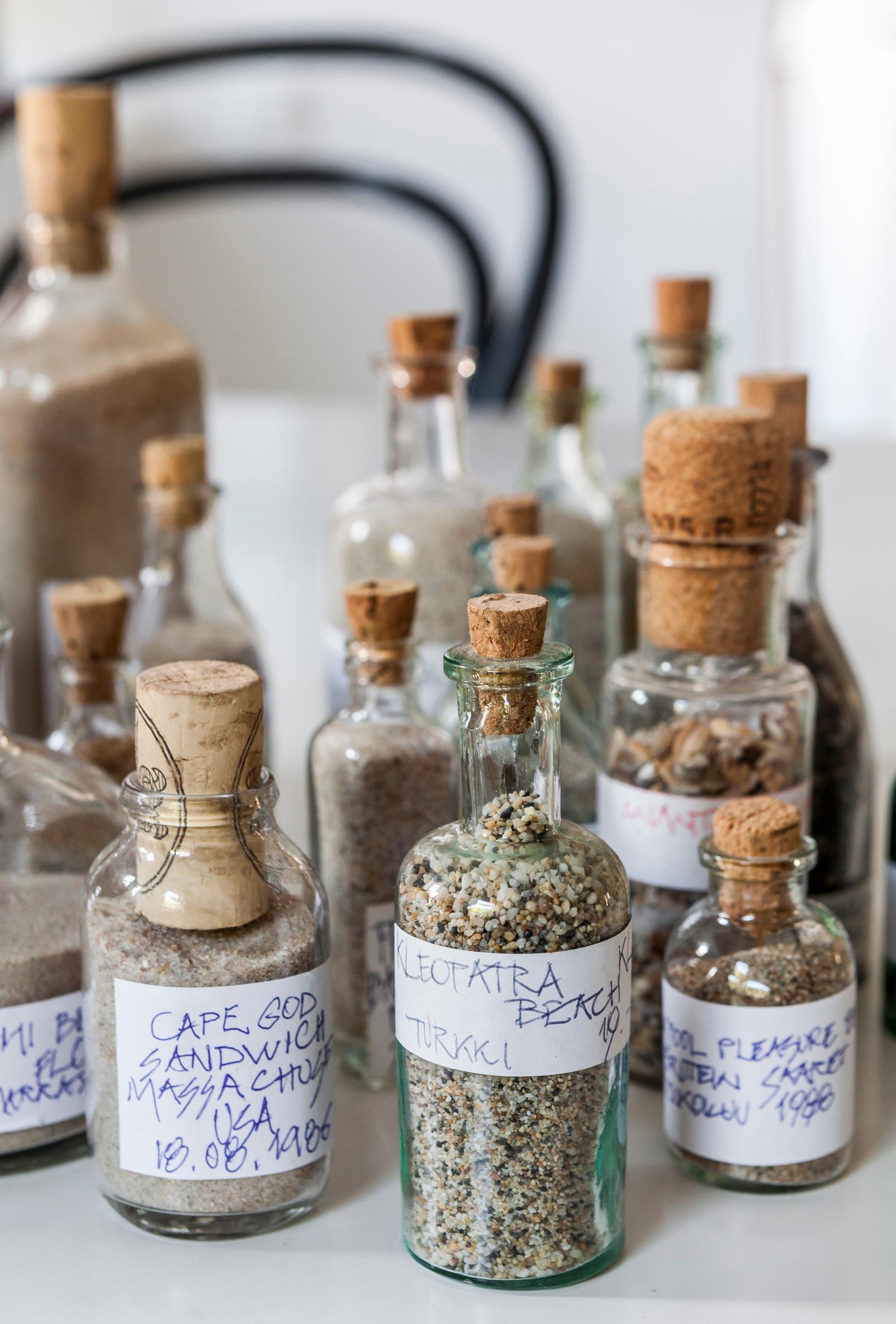 Tuula kattaa pöytään posliiniset kahvikupit ja pikkusuolaista. Esko haluaa vielä esitellä pariskunnan matkamuistoja ja ottaa esiin laatikon täynnä pieniä lasipulloja, joiden kylkeen on kirjattu paikka ja aika. Pulloissa on rantahiekkaa maailman joka kolkalta. Niissä tuoksuu meri, aurinko ja loma.
