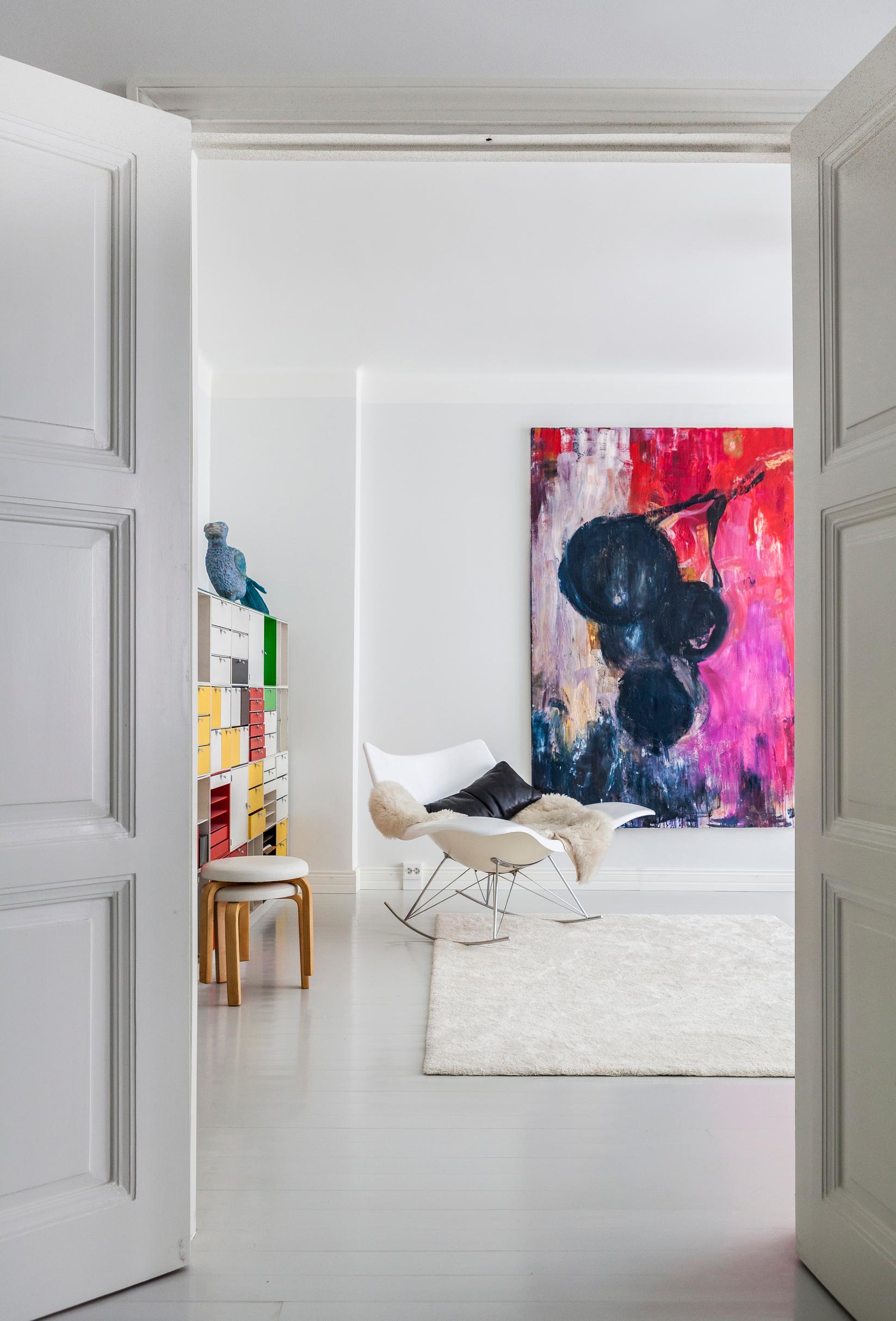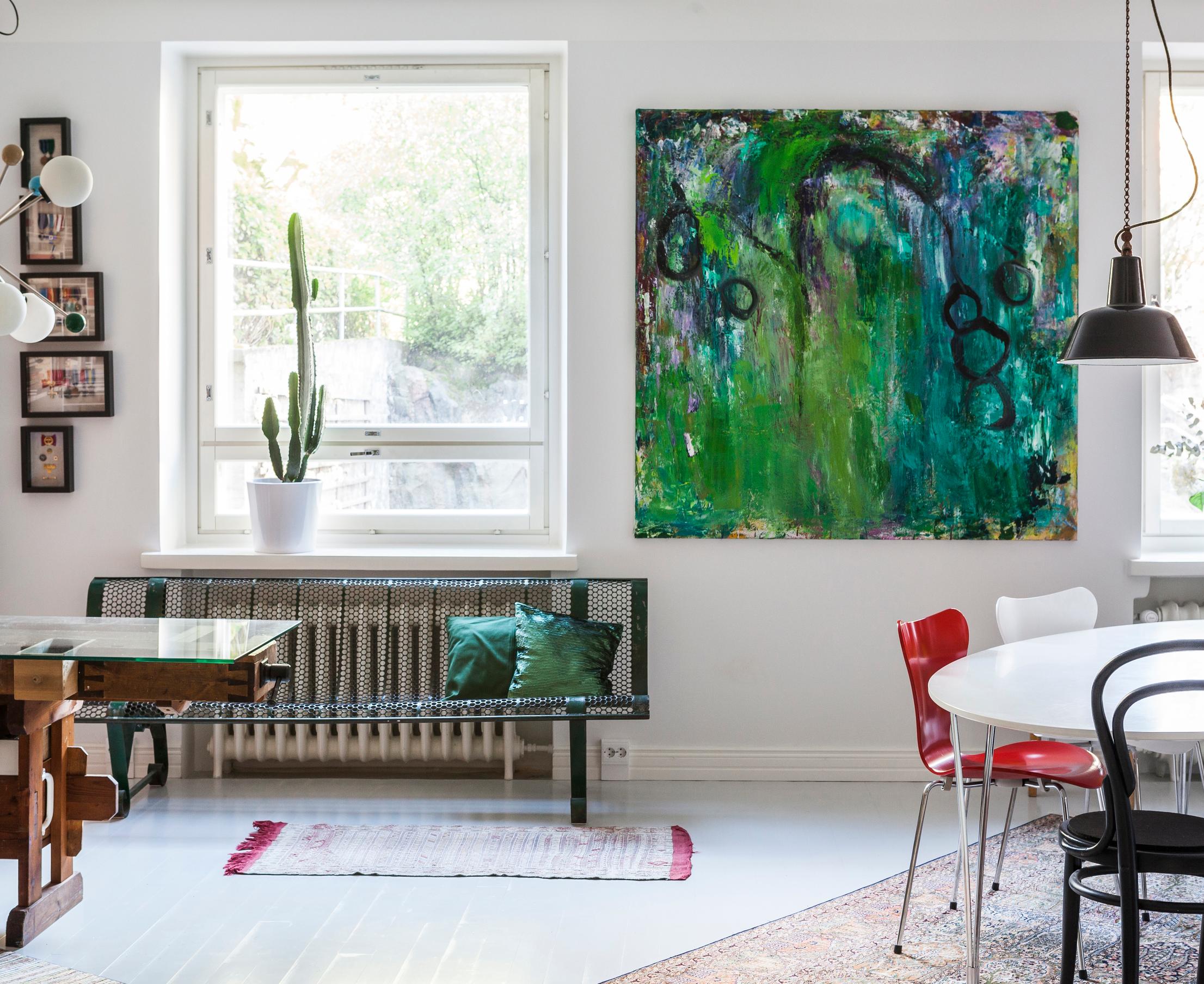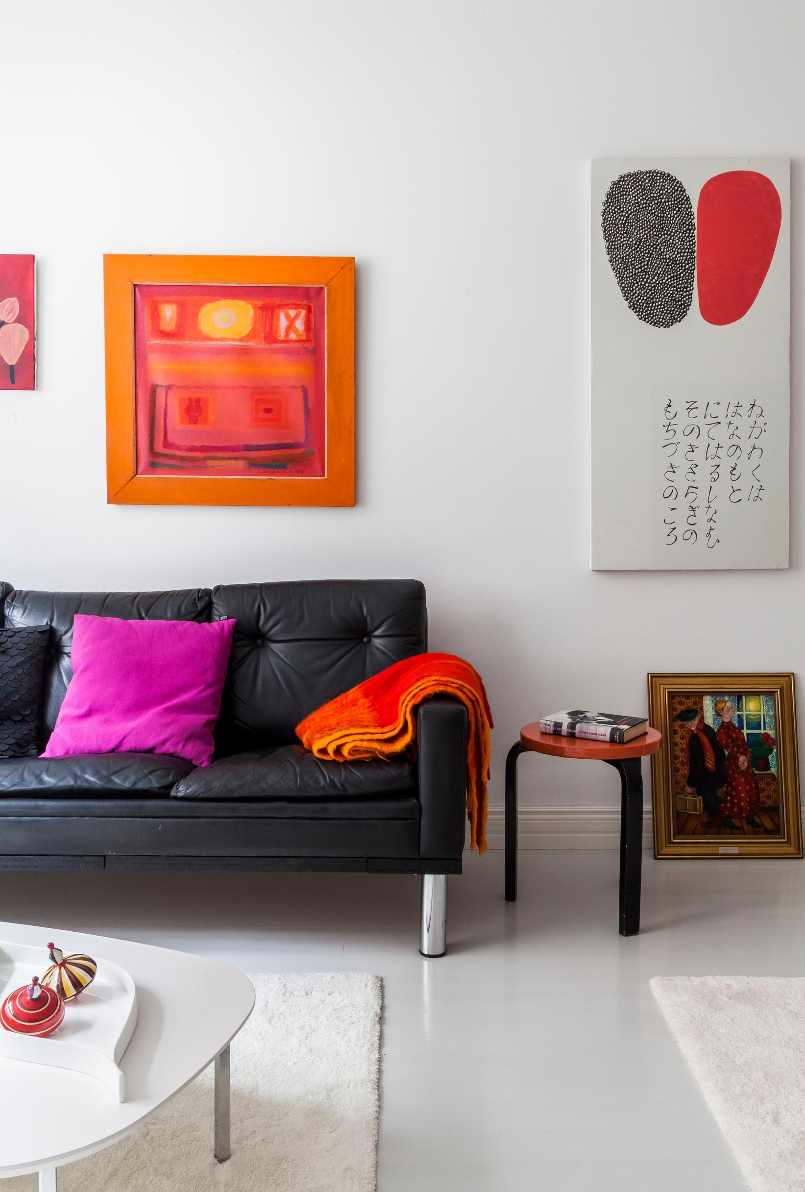 Kun Tuula ja Esko näkivät töölöläisasunnon ensimmäisen kerran, se oli järkyttävässä kunnossa. Mittavan remontin jälkeen avara koti muodostaa kauniin taustan pariskunnan yhteiselle intohimolle: värikkäille taideteoksille ja designkalusteille.