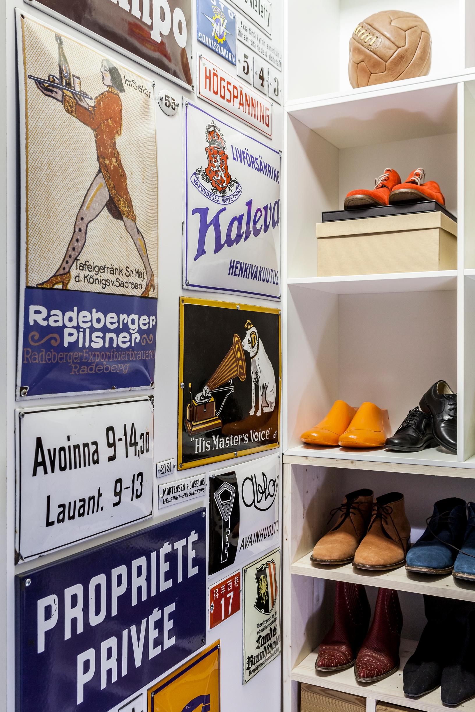 Kauniita ja kiinnostavia esineitä on Tuulan ja Eskon kodissa kaikkialla. Esko on innokas keräilijä, jonka saaliita ovat niin vaatehuoneen seinän kylttikokoelma kuin monet kodin kalusteet. Hän tekee löytönsä antiikkimessuilta ja kirpputoreilta.