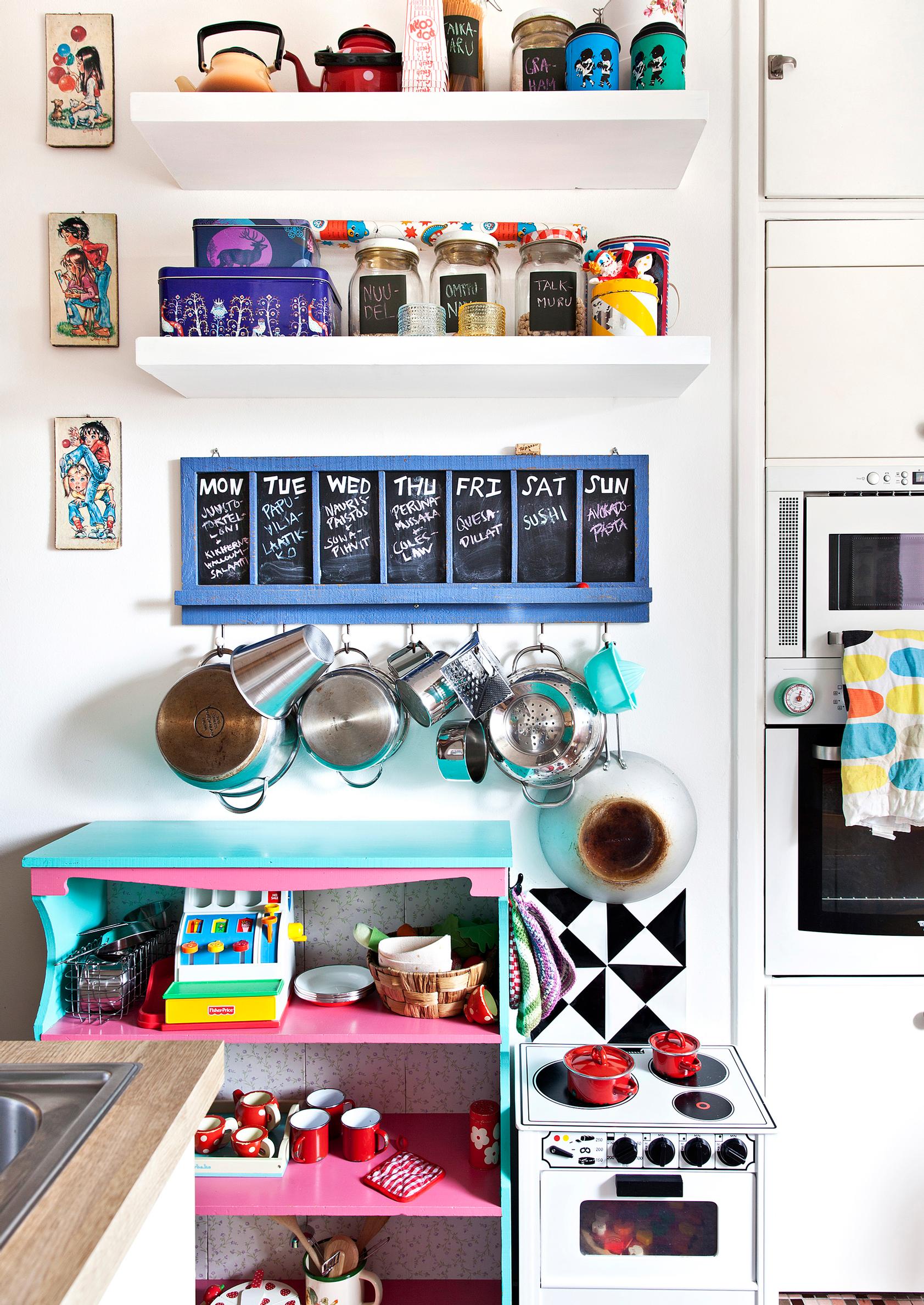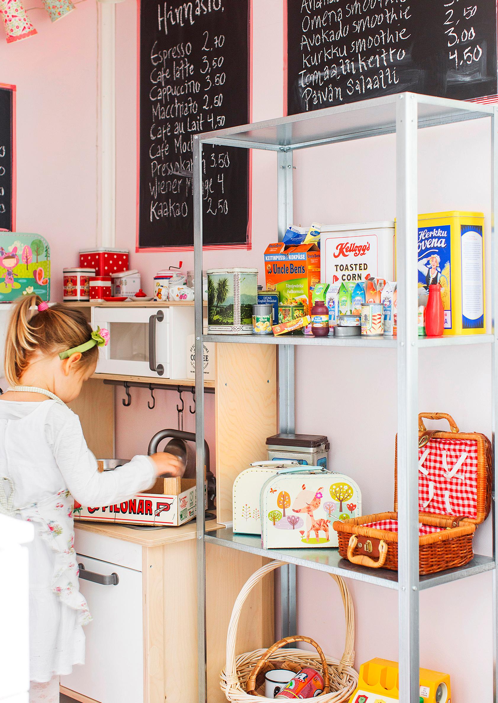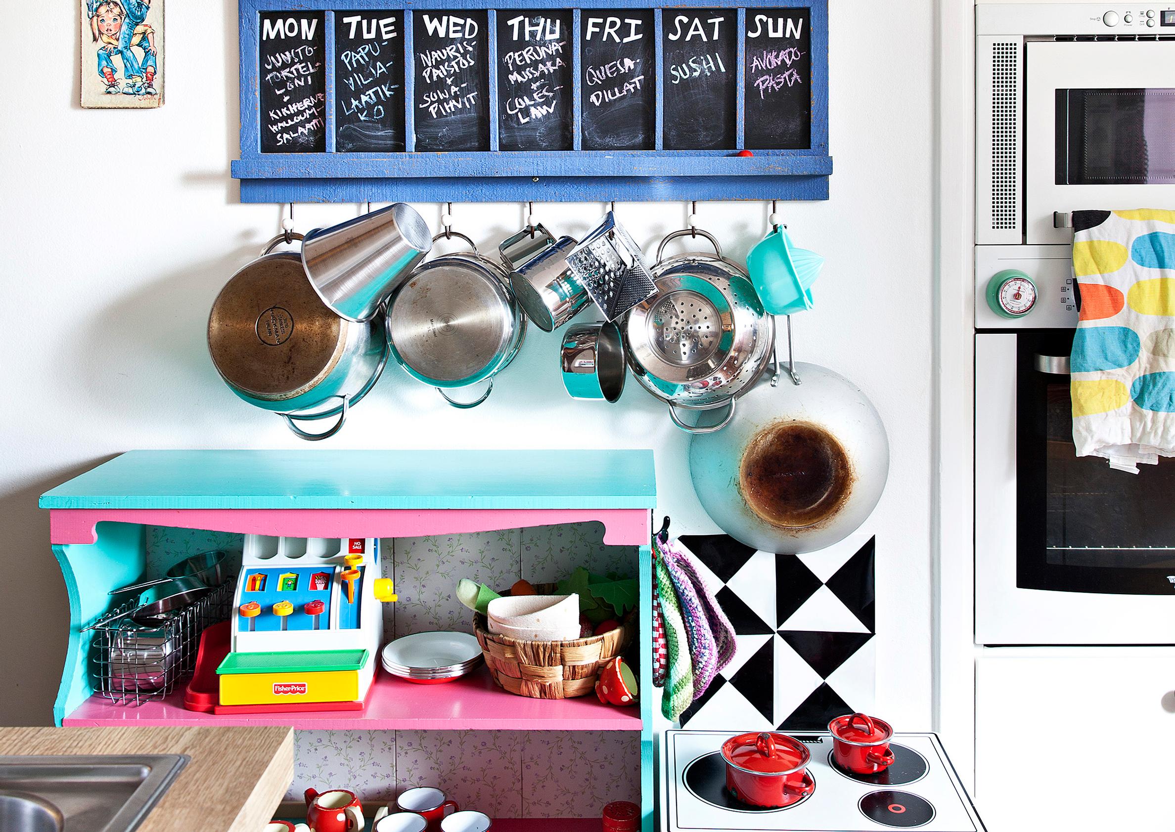 Perheen pikkukokille on tehty ikioma puuhanurkkaus kodin keittiöön. Siinä touhutessaan ahkera apuri malttaa odottaa oikean ruoan valmistumista. Leikkihella on kirpputorilta, hyllykkönä on entinen kenkähylly. Liitutauluun on kirjattu perheen viikon ruokalista.
