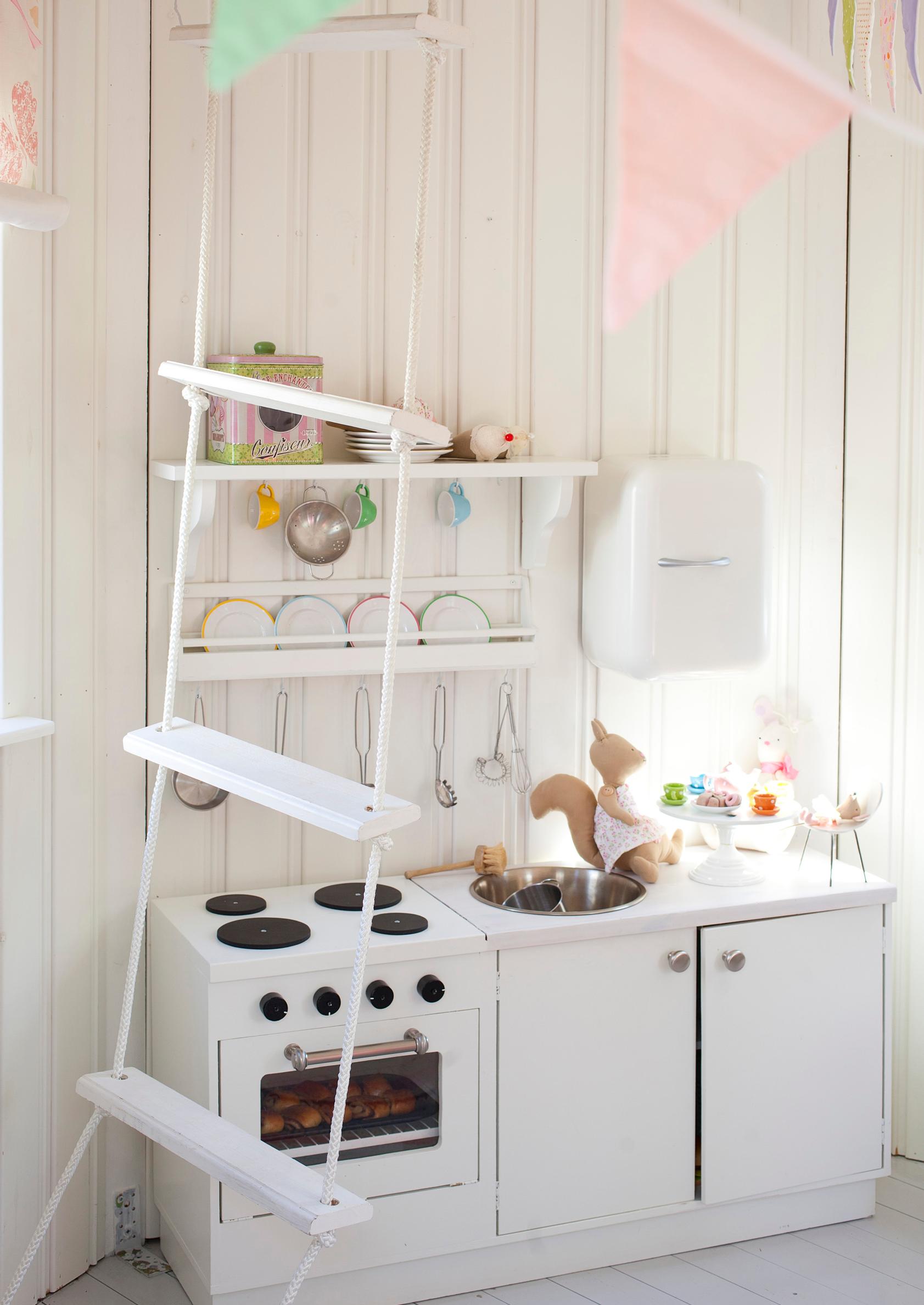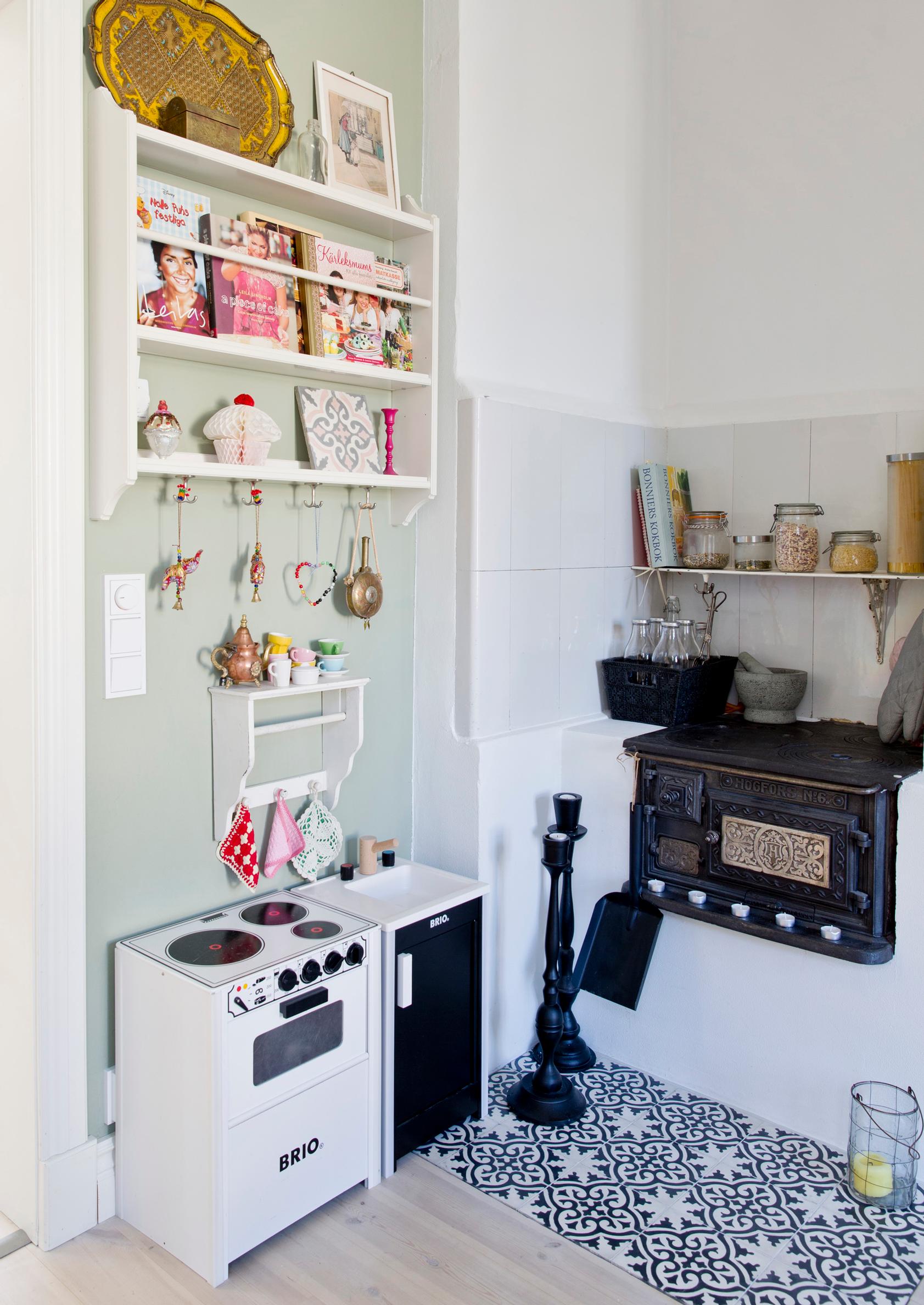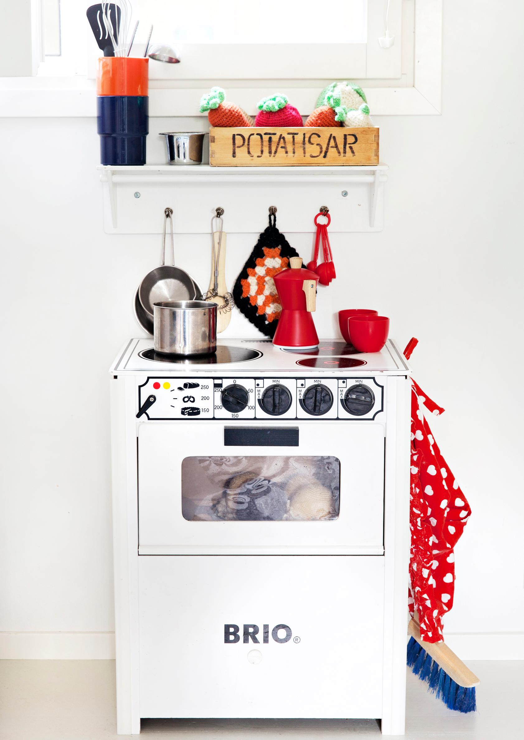 Perheen pikkukokille on tehty ikioma puuhanurkkaus kodin keittiöön. Siinä touhutessaan ahkera apuri malttaa odottaa oikean ruoan valmistumista. Leikkihella on kirpputorilta, hyllykkönä on entinen kenkähylly. Liitutauluun on kirjattu perheen viikon ruokalista.