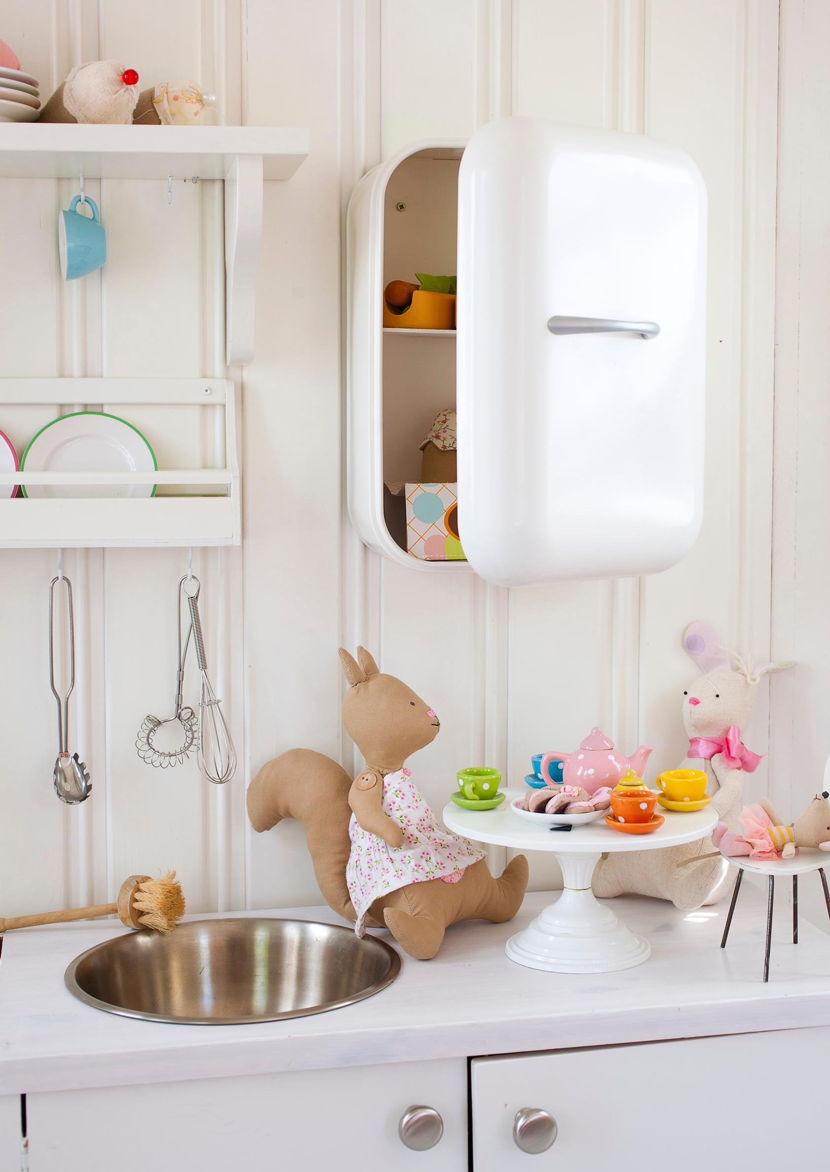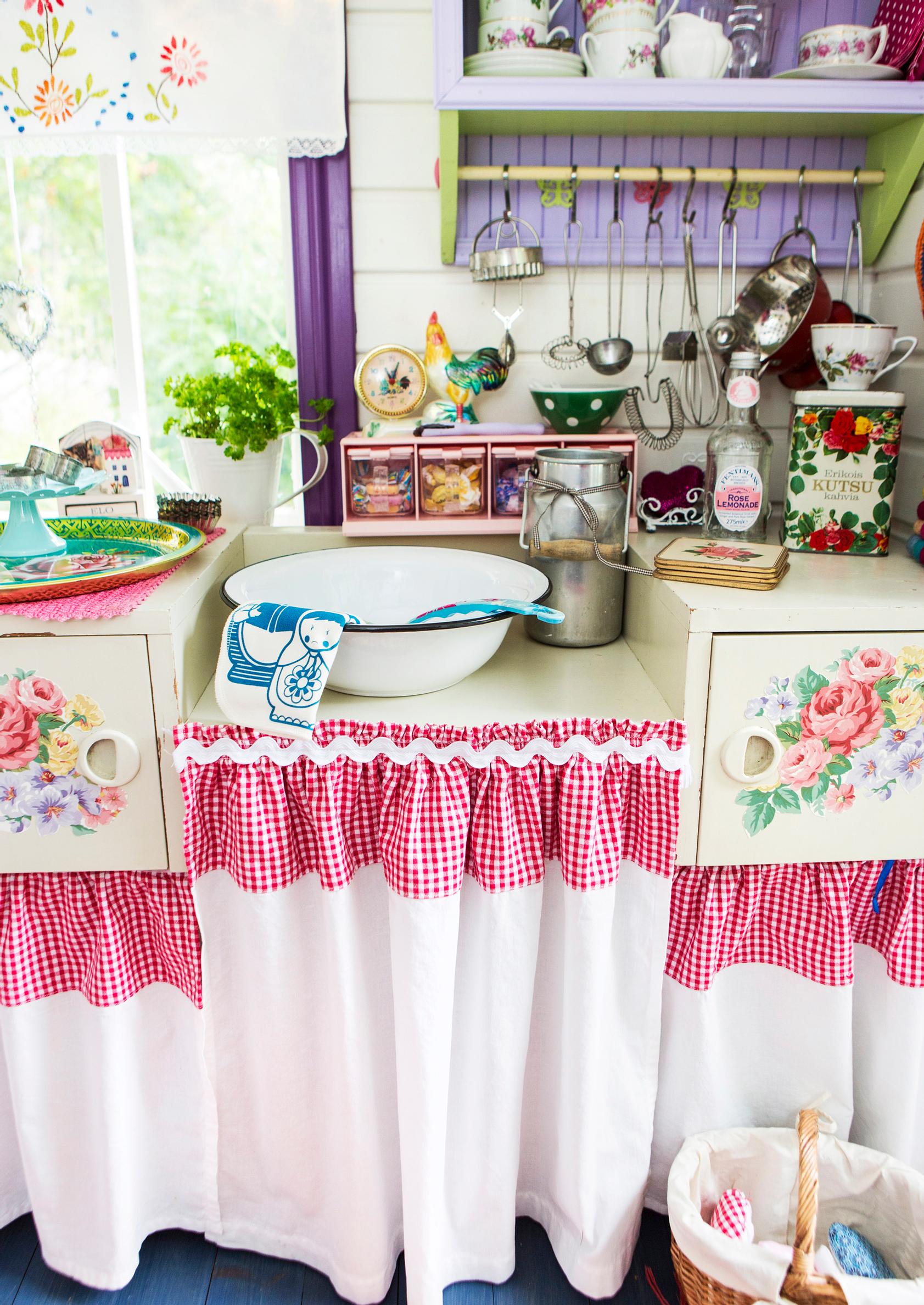Supersöpö leikkimökki on sisustettu kekseliäästi kierrättäen. Tiskipöytä on tehty huutokaupasta hankitusta kampauspöydästä. Peili poistettiin, nuhjuinen pinta maalattiin ja kaluste somistettiin boordista leikatuilla ruusuilla.