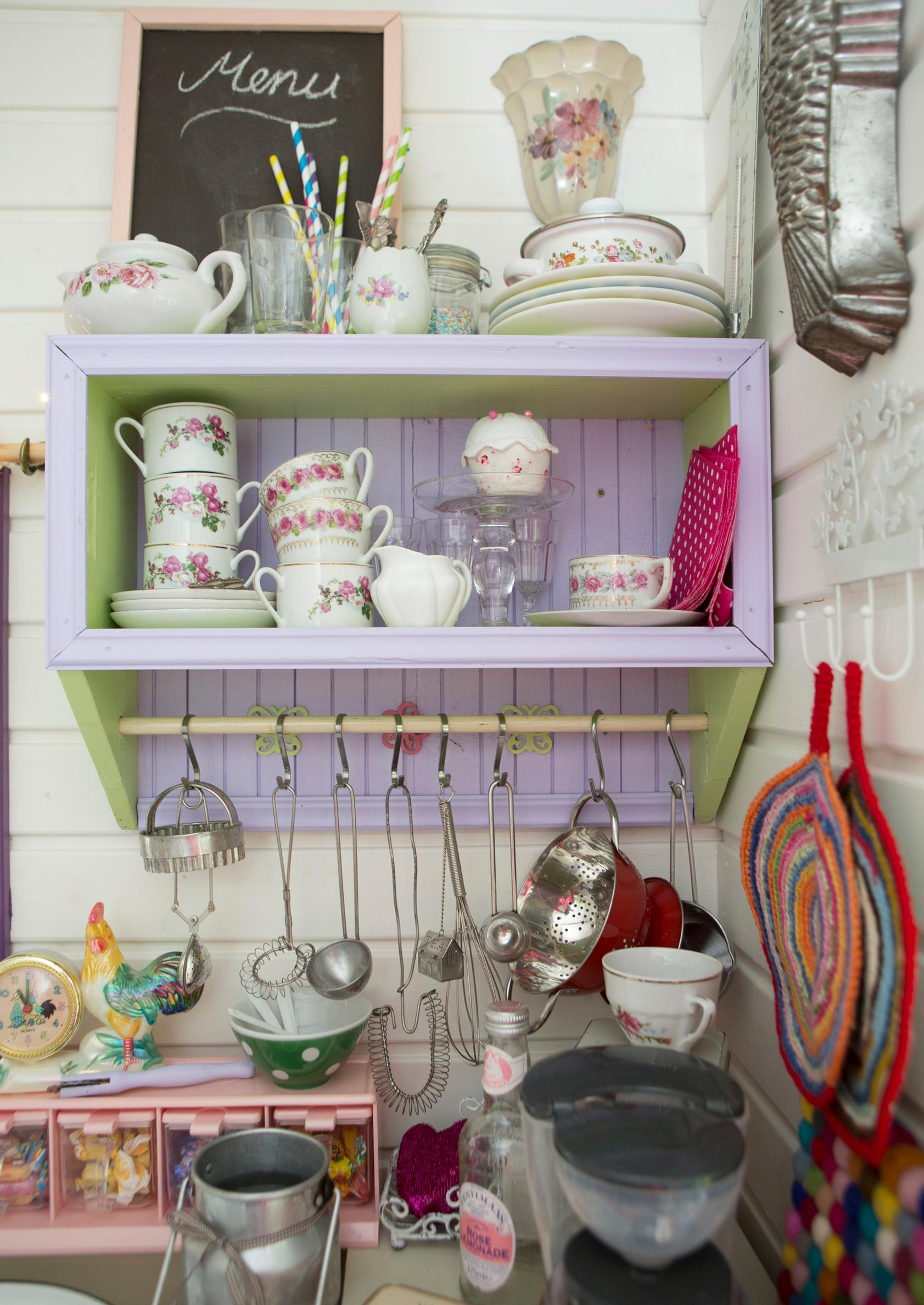 Leikkimökin astiahylly löytyi roskiksesta. Pienellä tuunauksella siitä tuli täydellinen säilö posliinisille ruusukupeille. Pyöröpuutangossa roikkuu oikeita kauhoja ja vispilöitä.