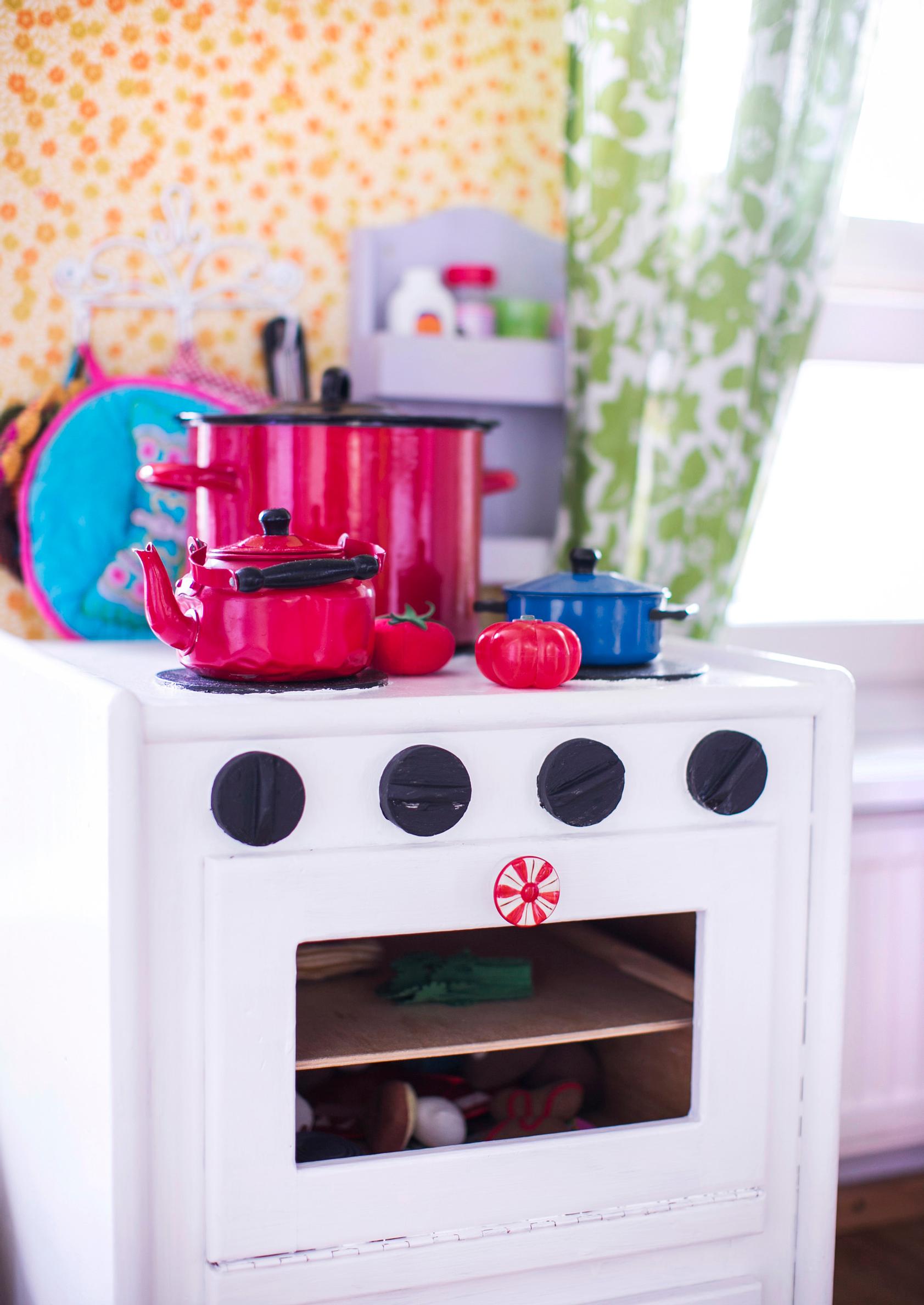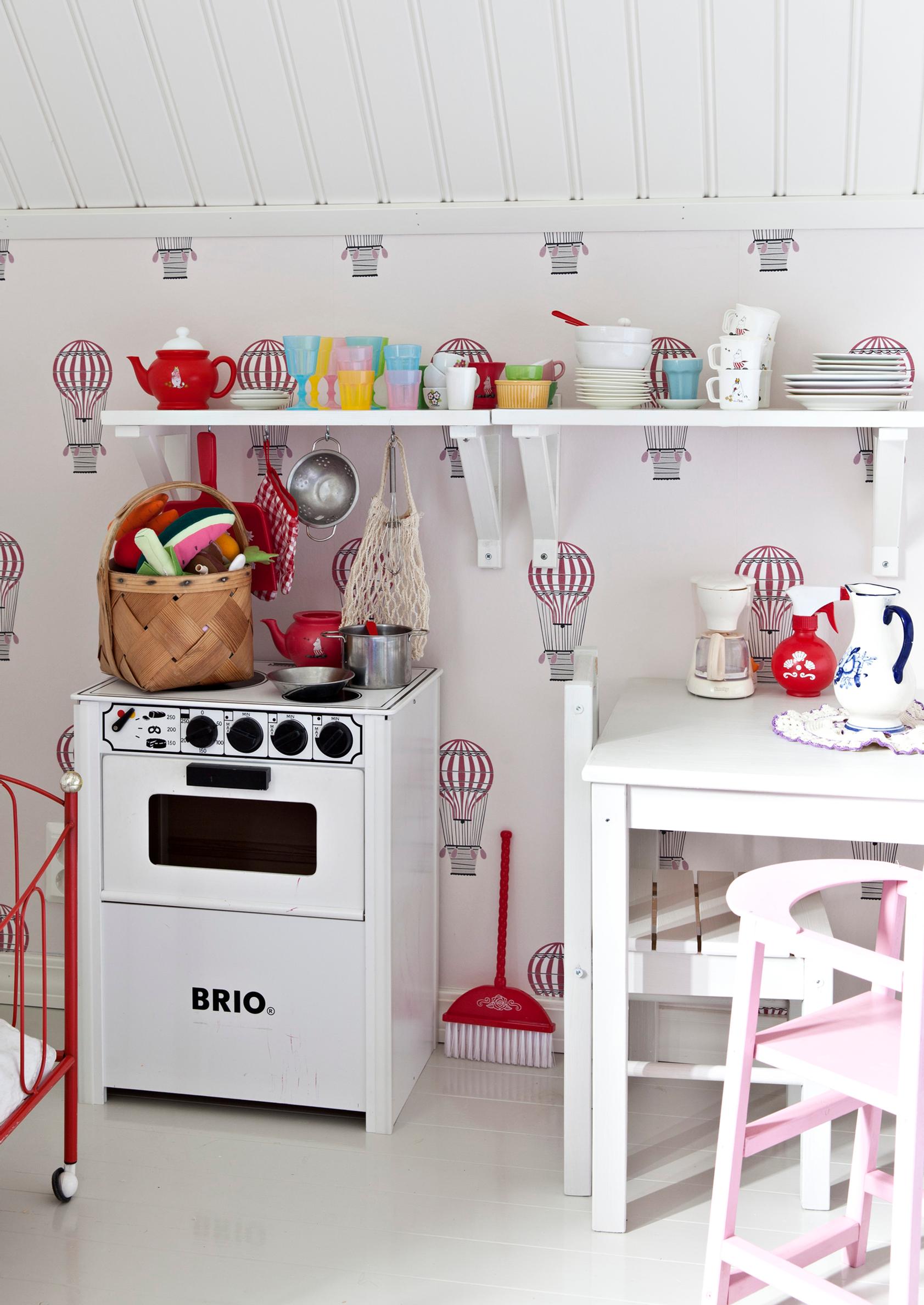 Iloisen värikkääksi sisustetun kodin keittiössä on myös lasten pikkuhella. Kierrätyskaluste oli ensin puunvärinen, sitten punainen ja nyt valkoinen. Taustatapettina on Tapettitalon Ilo.
