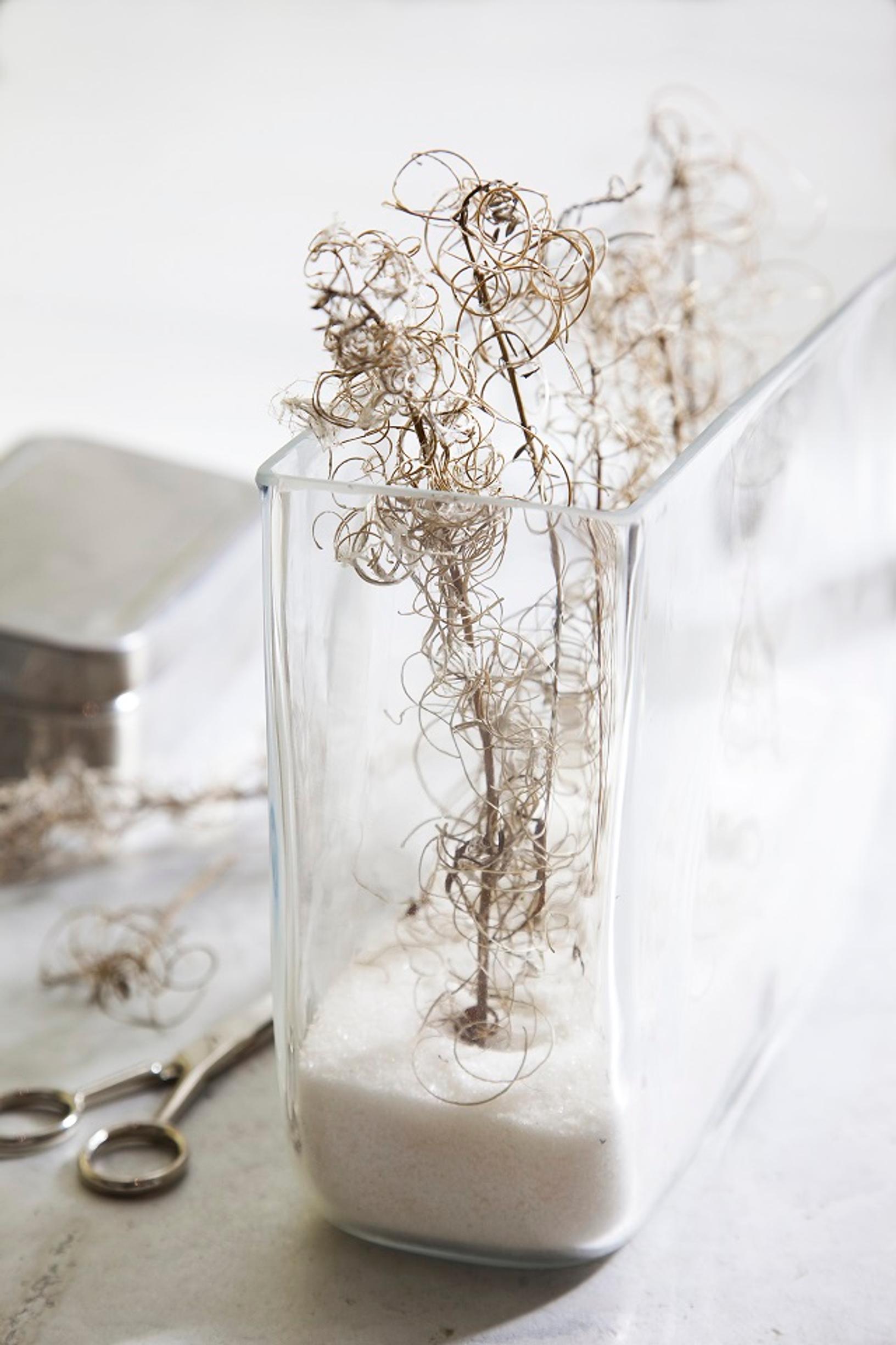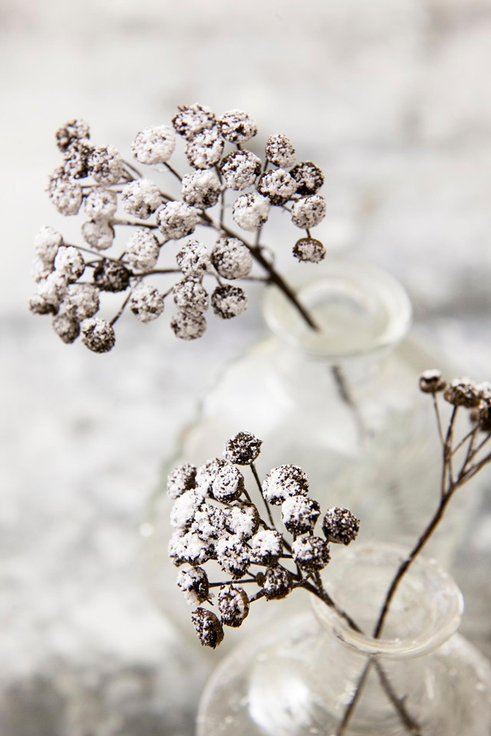 Pietaryrtti sai suihkauksen huurresprayta. Taita muutama oksa maljakkoon, ja sinulla on talven kuvauksellisin asetelma. Käsittele pietaryrttiä hellästi, etteivät sen siemenet varise.