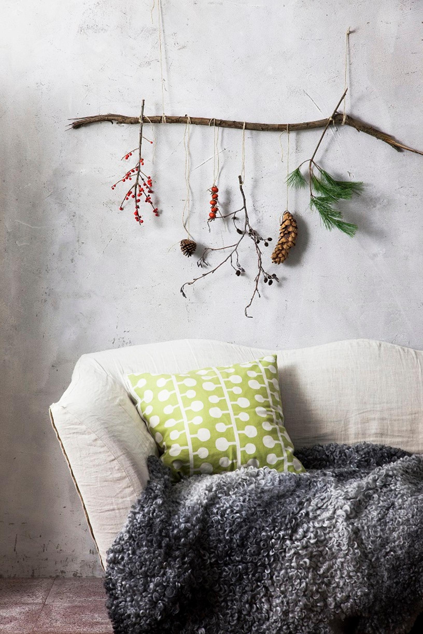 Oksalle ripustettiin ilexian punamarjainen oksa, männynkäpy, rautalankaan pujotettuja ruusunmarjoja, tervalepän oksa, kuusenkäpy sekä sembramännyn oksa. Muista jokamiehen oikeudet: rauhoittamattomia kasveja, pudonneita oksia ja käpyjä saa poimia.