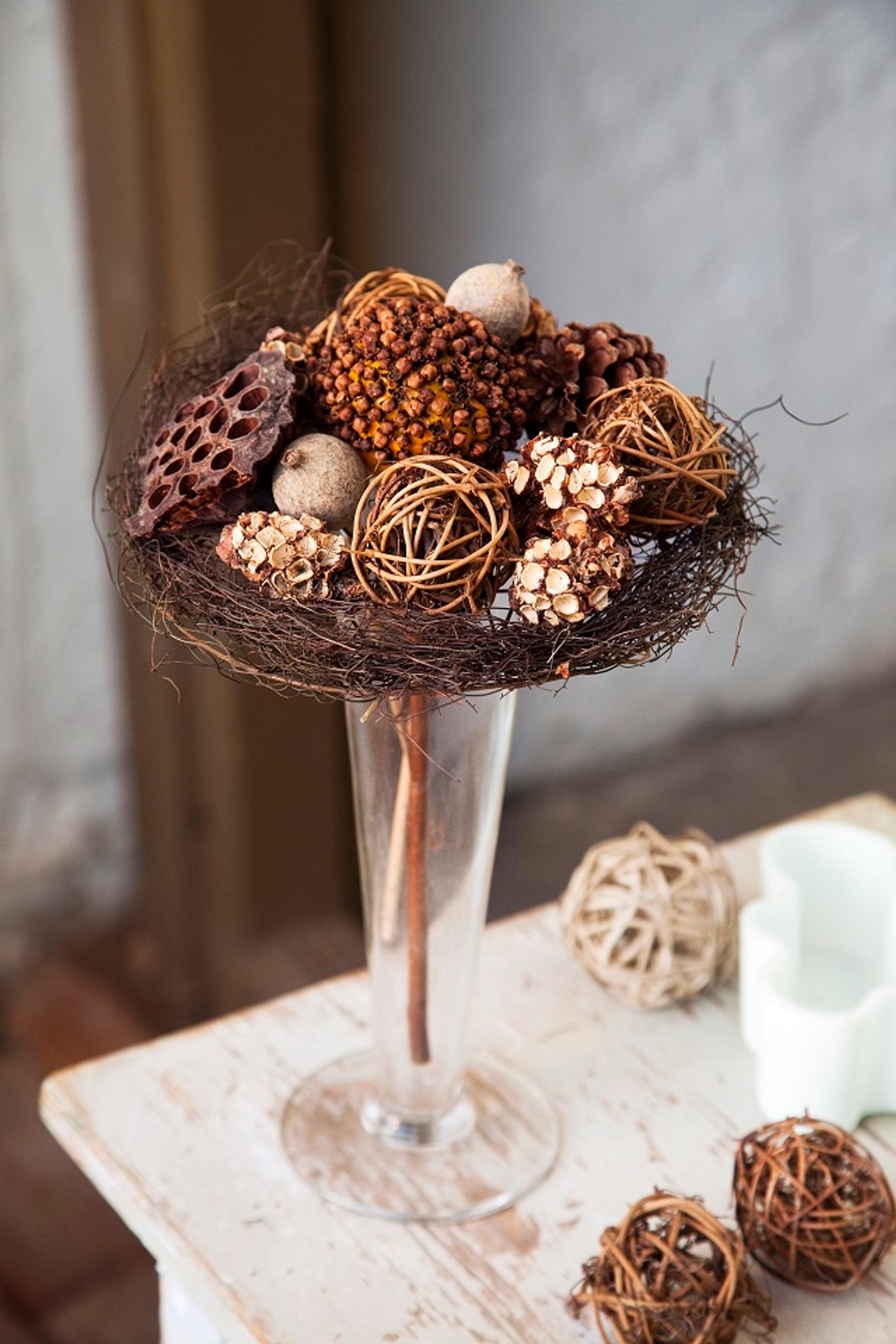 Risupohjan keskelle on aseteltu neilikoilla pistelty mandariini. Ympärille kiinnitettiin kuumaliimalla oravan syömiä männynkäpyjä, risupalloja ja siemenkotia. Pohjaa, palloja ja siemenkotia myyvät askarteluliikkeet.