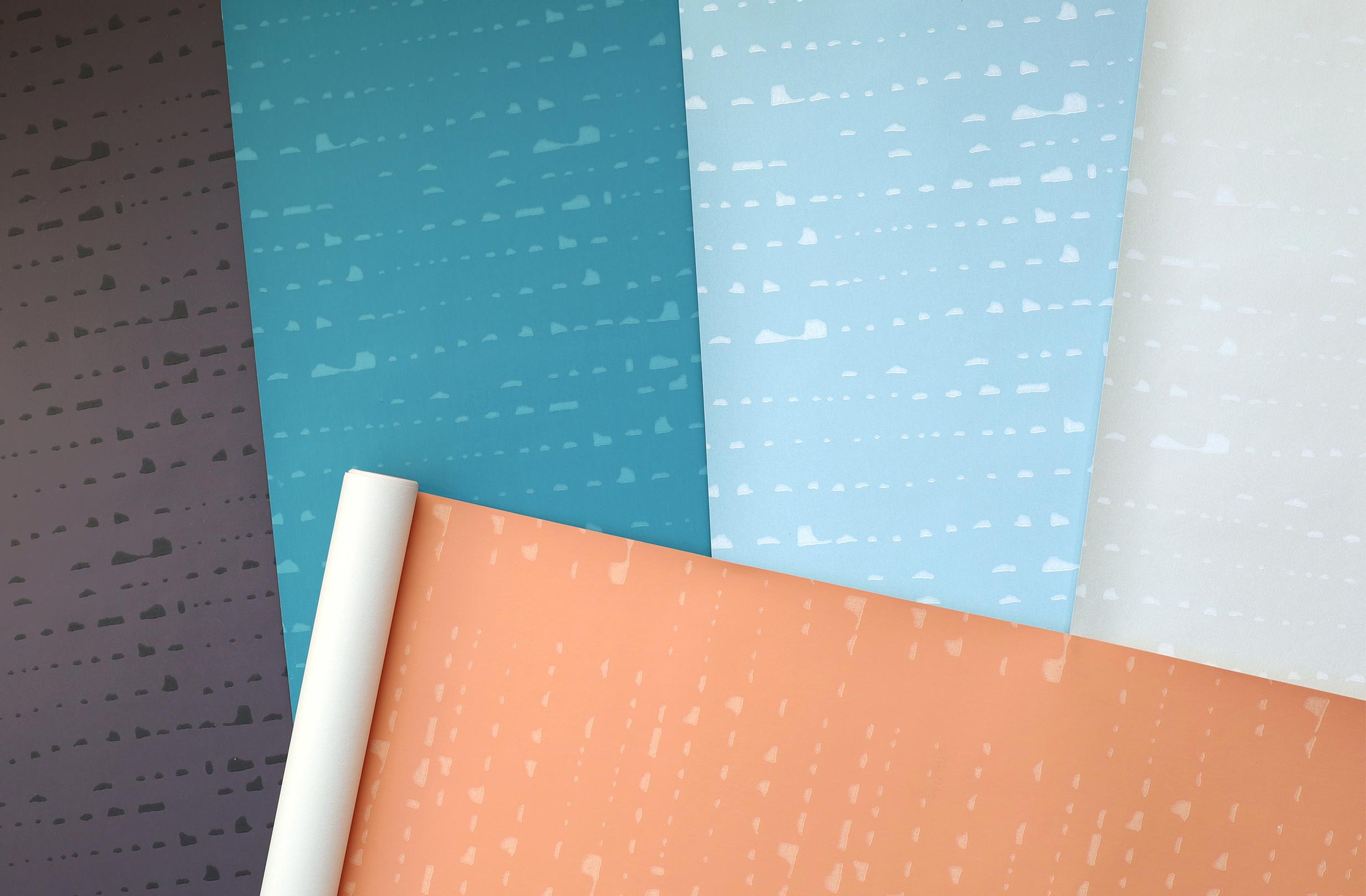 Juolu-tapetista on saatavilla viisi eri värivaihtoehtoa: tumma turkoosi, vaalea turkoosi, helmiäsvalkoinen, poltettu oranssi sekä tumma violetinruskea.