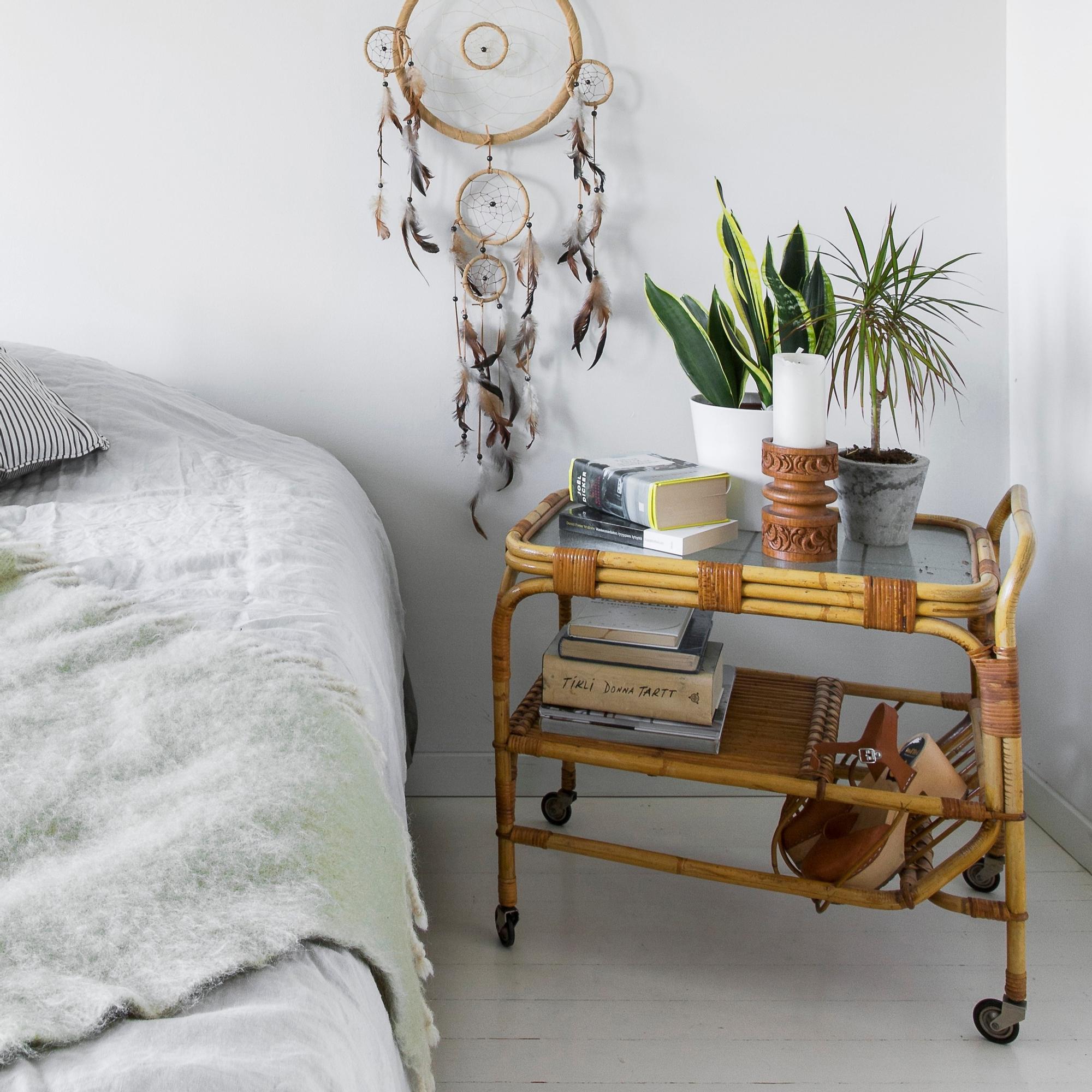 1950-luvun tarjoiluvaunu sopii kukille ja yöpöydäksi. Sisustus on ilmava, kun kärry on vinottain. Rottinkisia tarjoiluvaunuja myy muun muassa Fargo vintage ja Parolan rottinki.