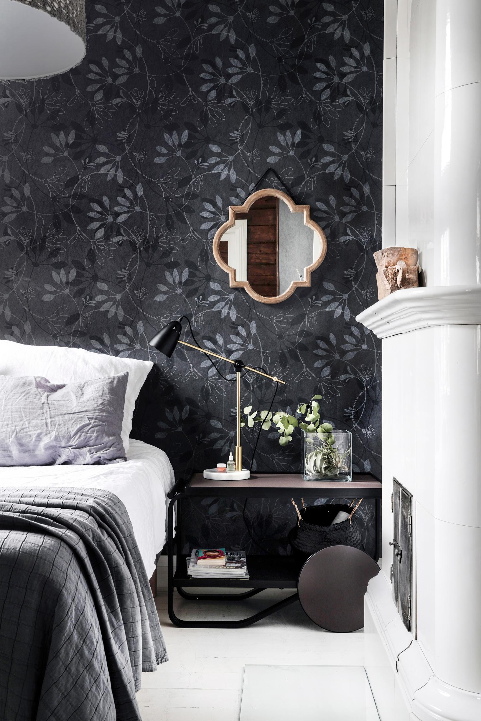 Alvar Aallon suunnittelema Aalto 901 -tarjoiluvaunu on tyylikäs yöpöytä, jonka alahyllylle mahtuu isompikin kirjapino. Musta kaluste sulautuu tummaan tapettiin.