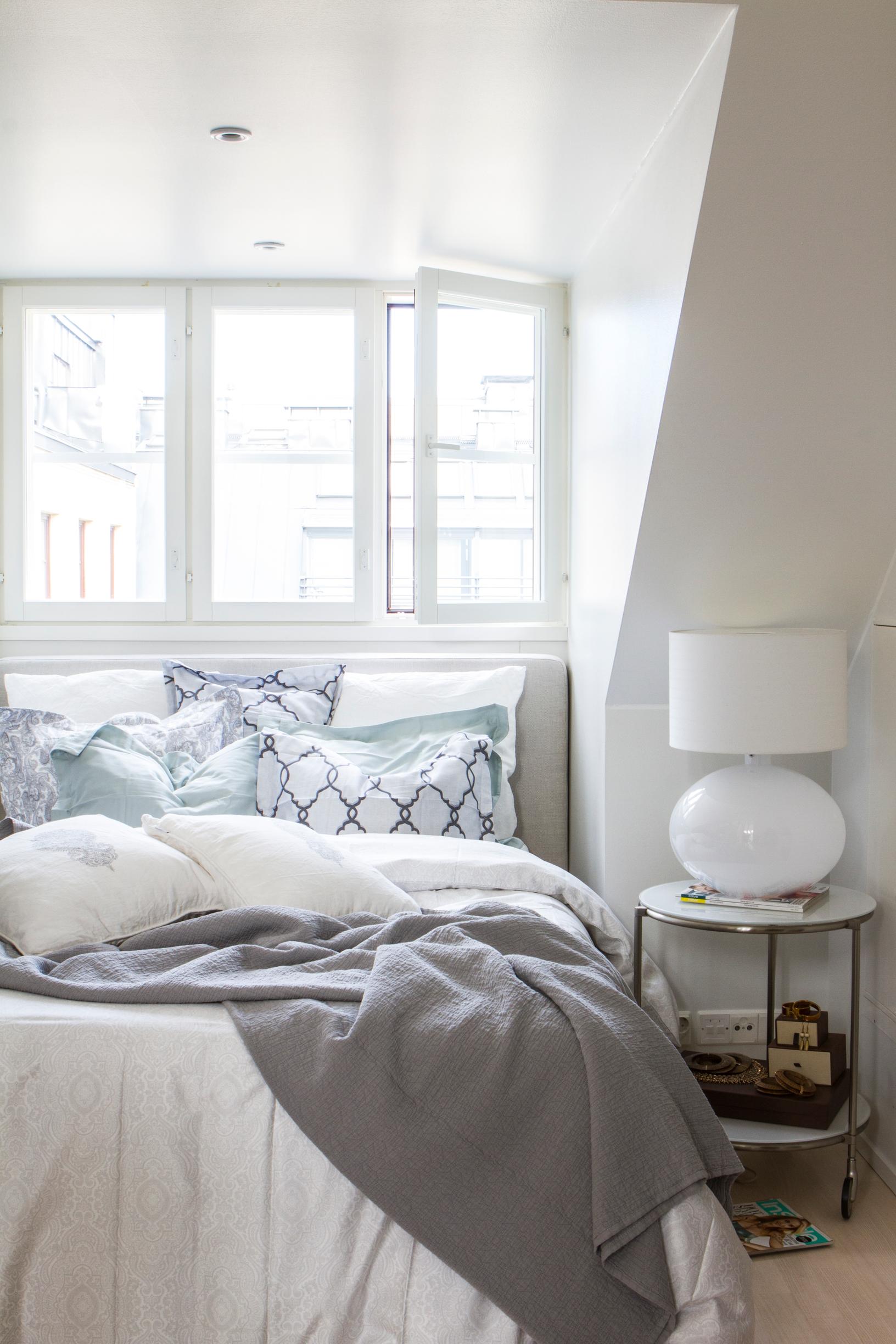Art deco -tyylinen tarjoilukärry on kuin luotu romanttisen makuuhuoneen yöpöydäksi. Metallirunkoinen kaluste on Ikean vanhasta mallistosta. Näitä kannattaa etsiä Tori.fi:stä.
