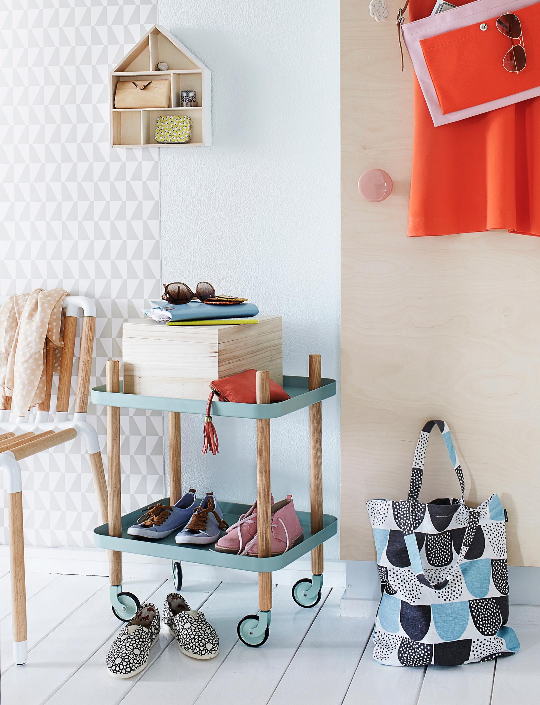 Tarjoiluvaunu on näppärä lisäkaluste pienessä eteisessä. Kärryn ylähylly toimii laskutasona ja alahylly kenkätasona. Kuvan vaunu on Normann Copenhagenin Block.