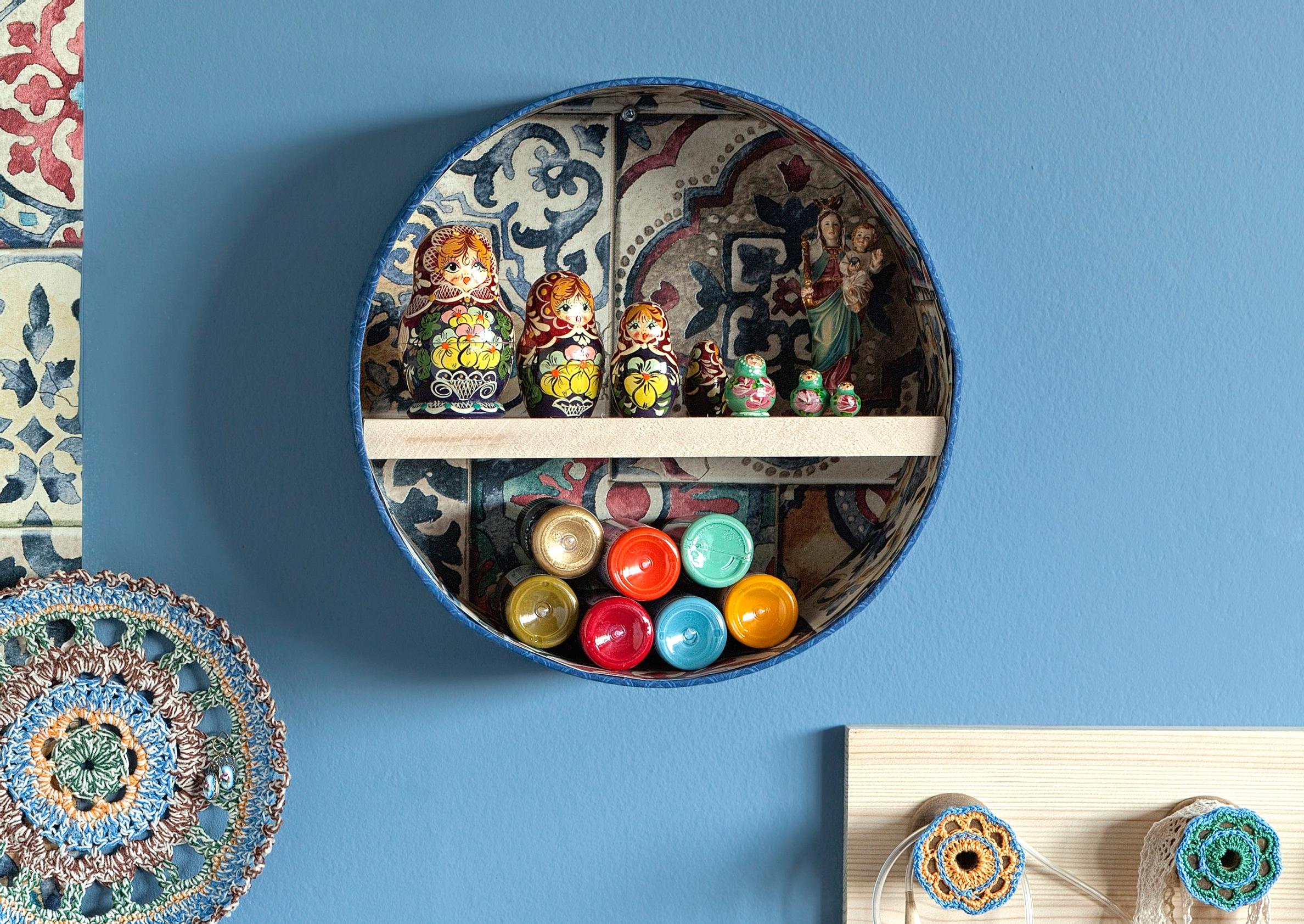 Hauska hylly on helppo tehdä pyöreästä rasiasta ja laudanpätkästä. Useammasta rasiasta saat työpisteeseen hyllykollaasin, johon saat askartelutavarat nätisti ja kätevästi käden ulottuville.
