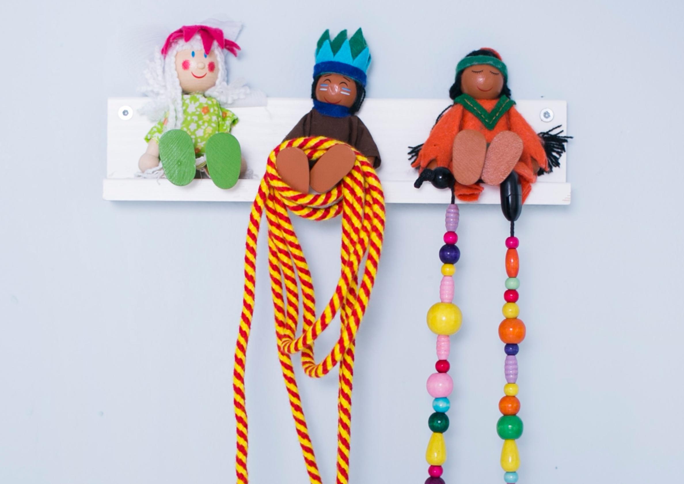 Veikeä lasten naulakko valmistuu hetkessä. Tarvitset muutaman hahmon koukuiksi ja kulmalistaa rungoksi. Koukuiksi sopivat myös Lego- ja Playmobile-nuket.