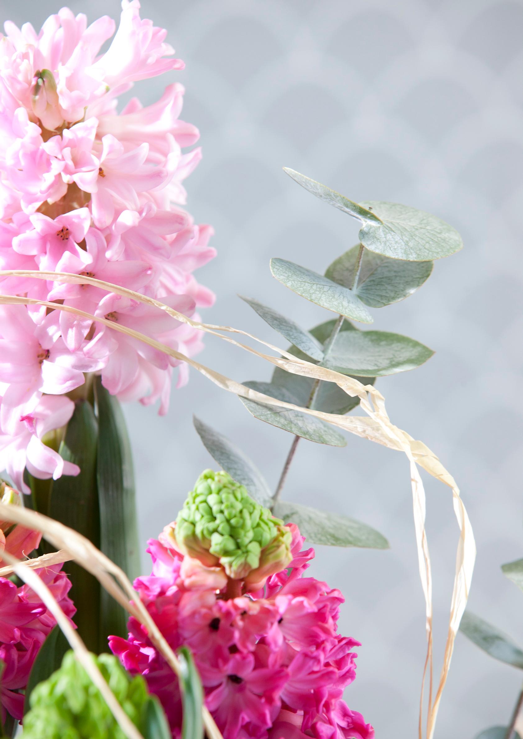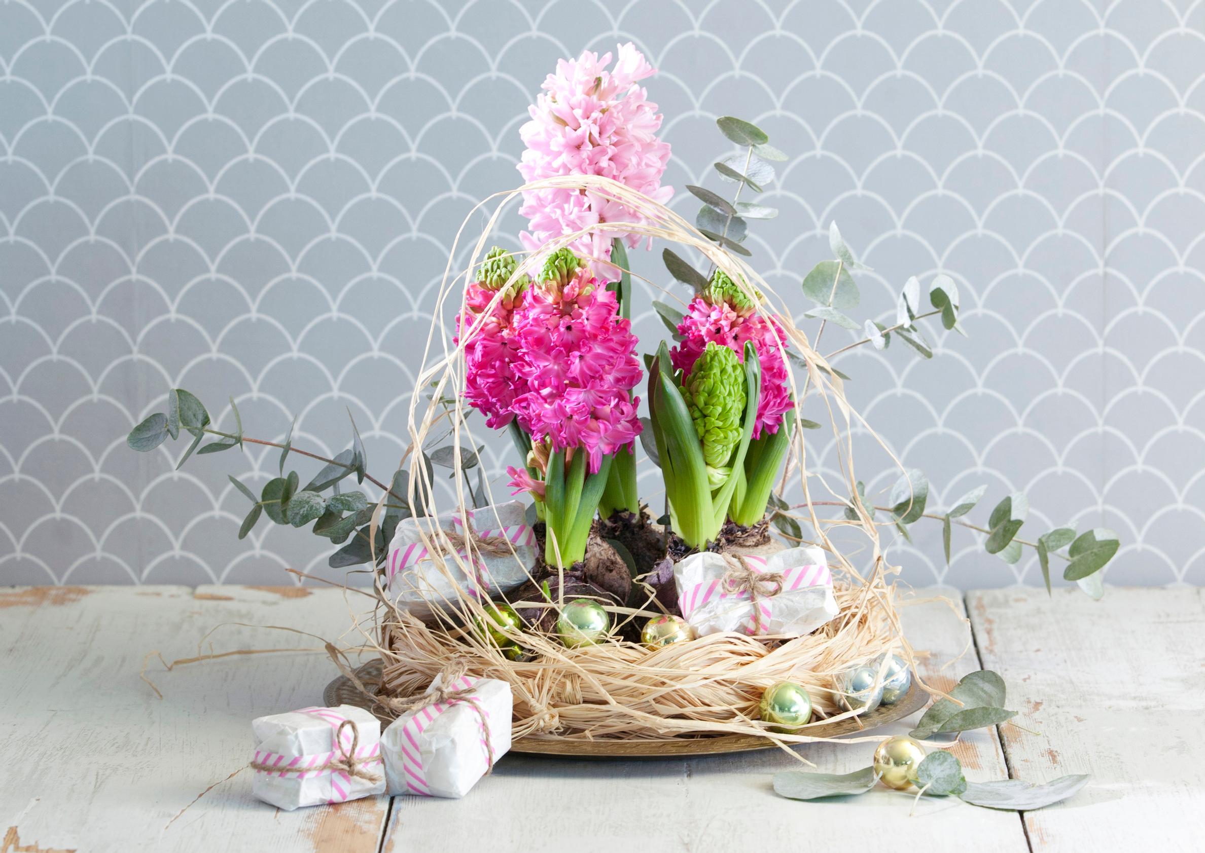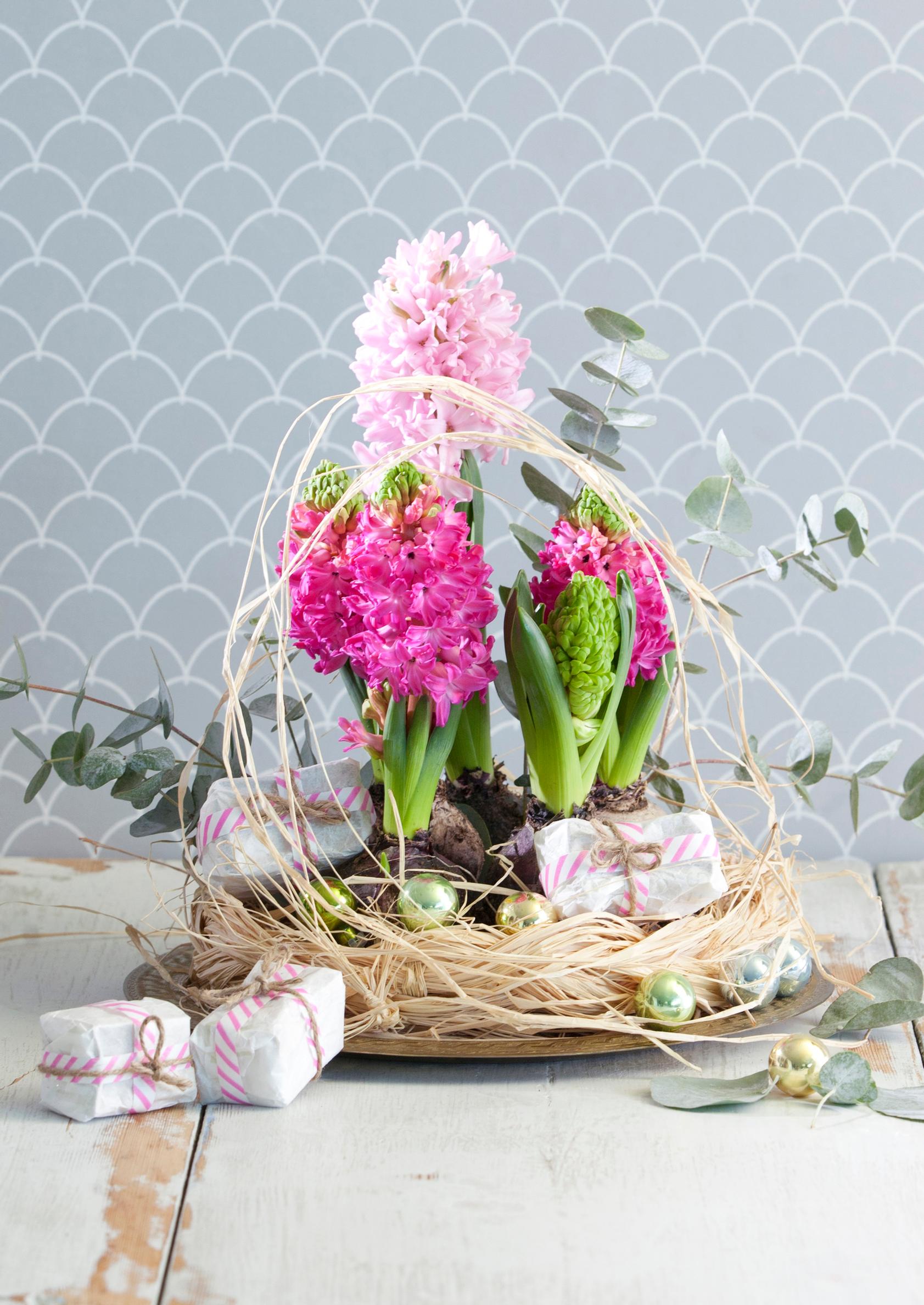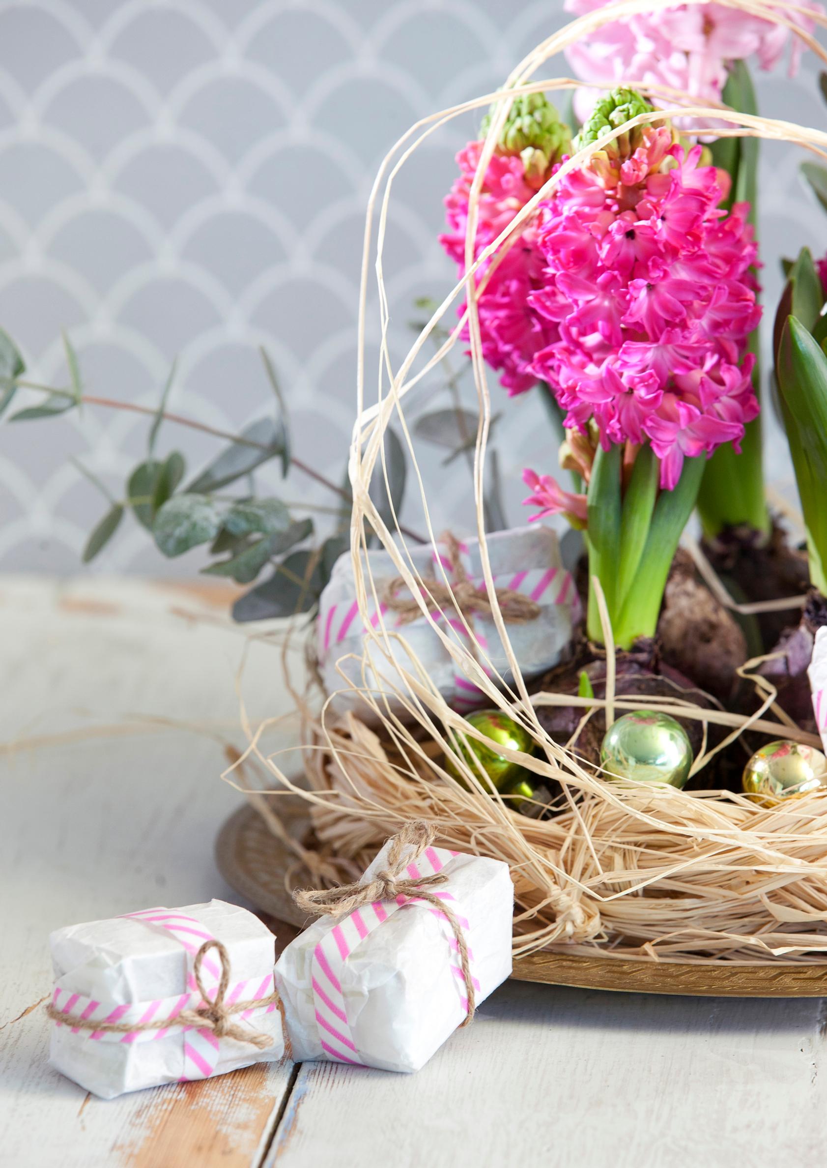 Helppo ja hurmaava hyasinttiasetelma syntyy, kun palmikoit kukille kauniin pesän niinestä. Joulupallot ja koristeelliset pikkupaketit viimeistelevät kokonaisuuden.