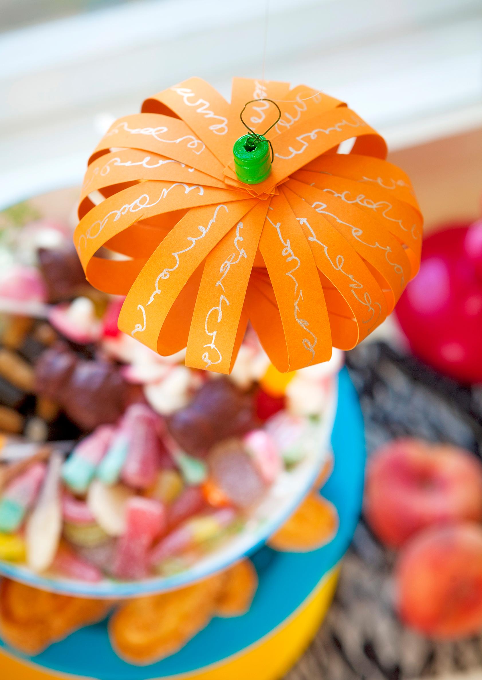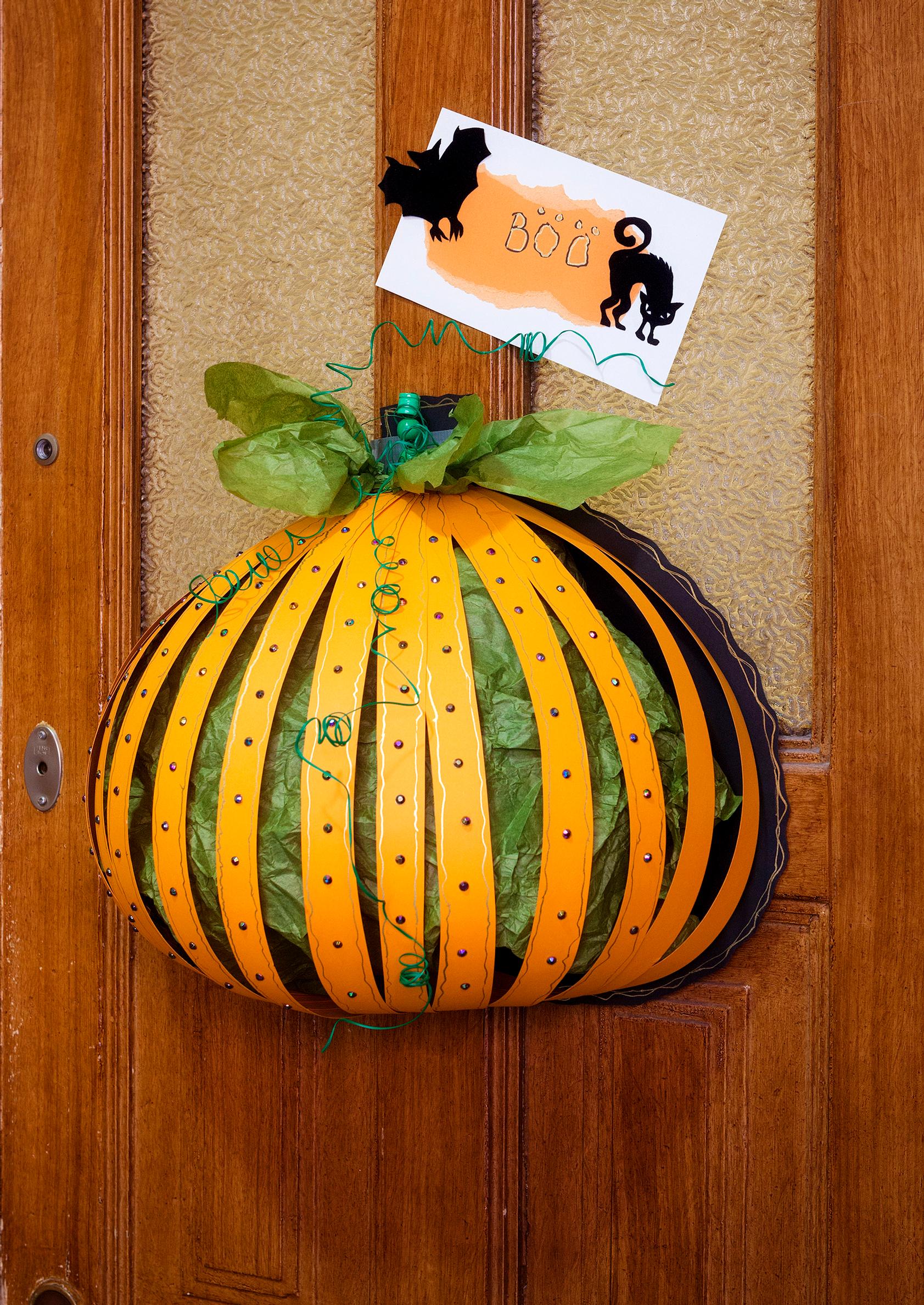 - Taita muita pidemmän liuskan päät sisäpuolelle ja liimaa kurpitsa niistä taustapahviin.