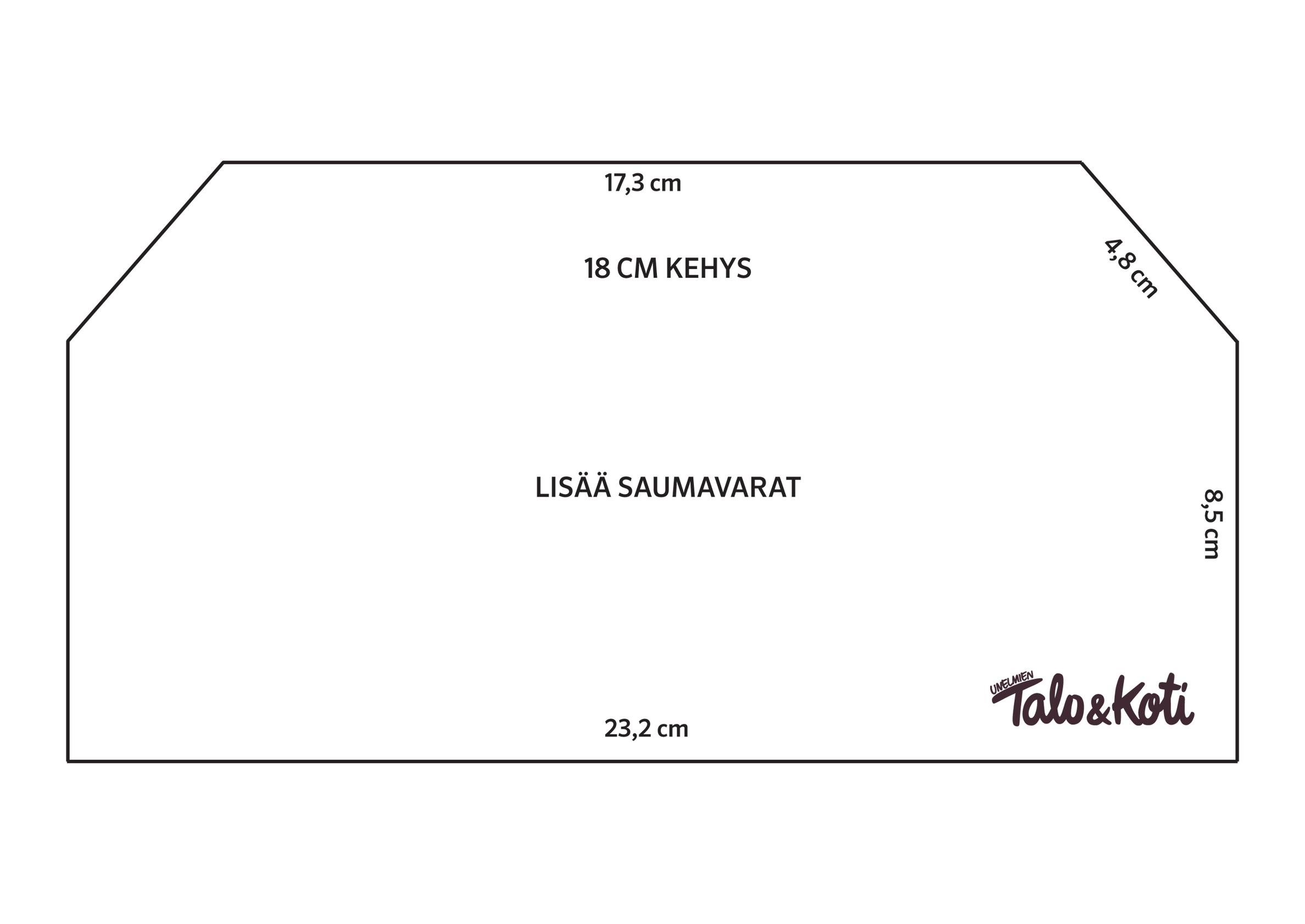 2. Leikkaa kaksi päällis- ja kaksi vuorikappaletta kaavan mukaan. Lisää saumanvarat.