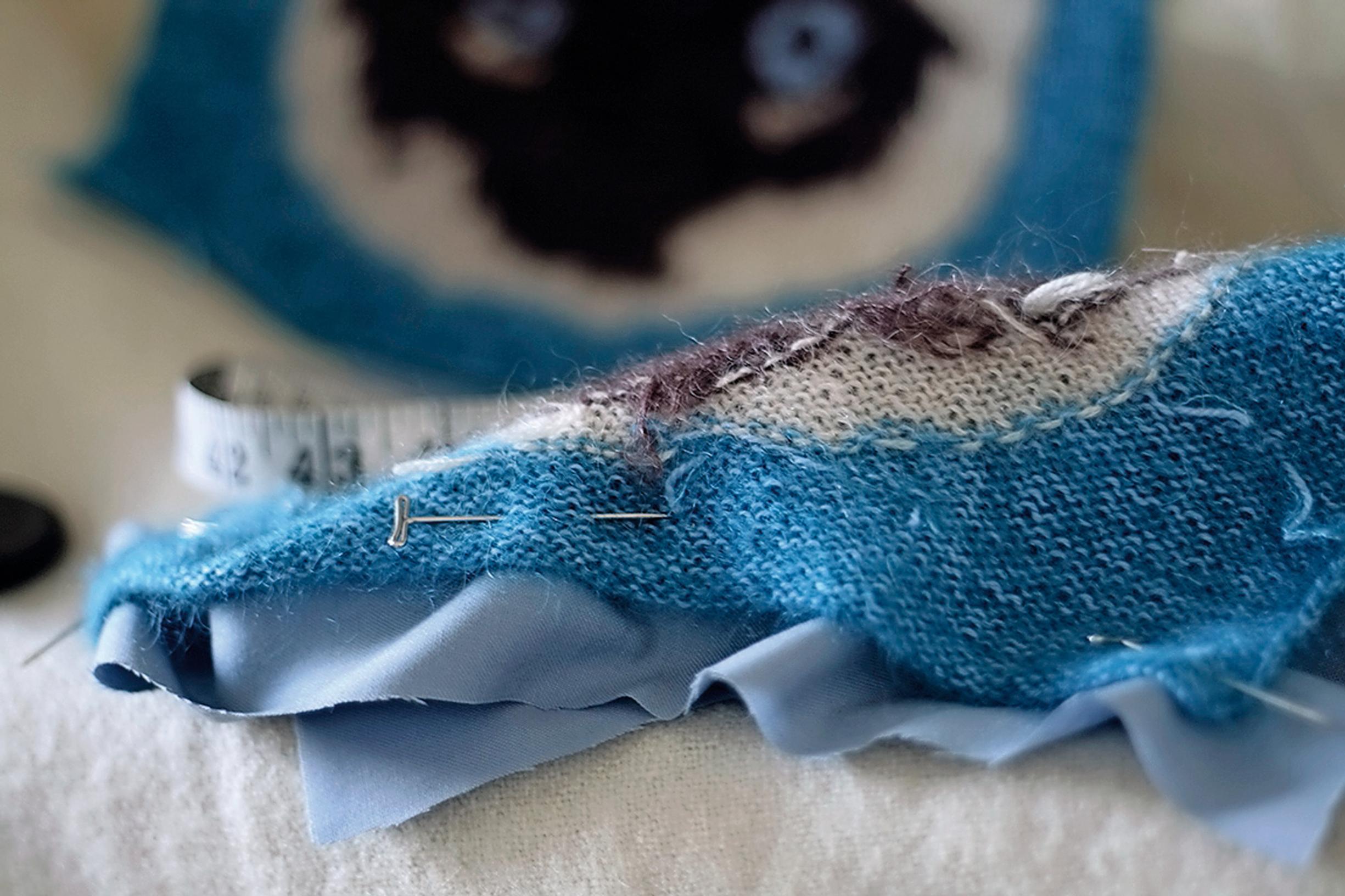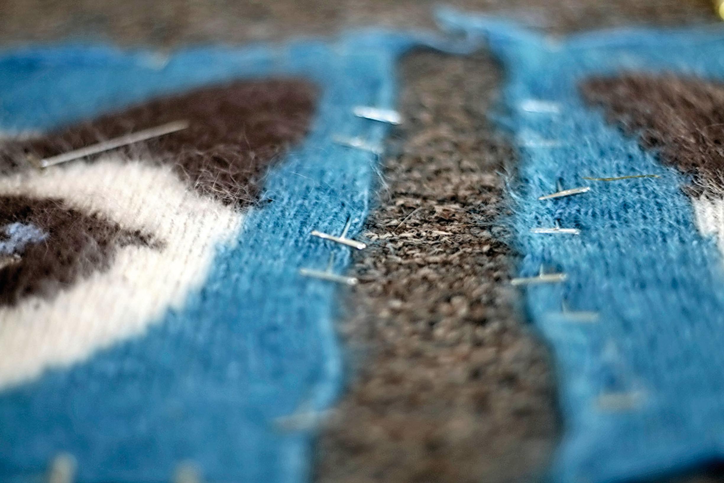 5. Avaa pyyhe ja levitä kappaleet imukykyiselle alustalle, esim. matolle n. 30x30 cm kokoiseksi. Kiinnitä reunat nuppineuloin ja anna kappaleiden kuivua. 6. Leikkaa kankaasta 2 n. 30x30 cm kappaletta ja silitä kappaleet.