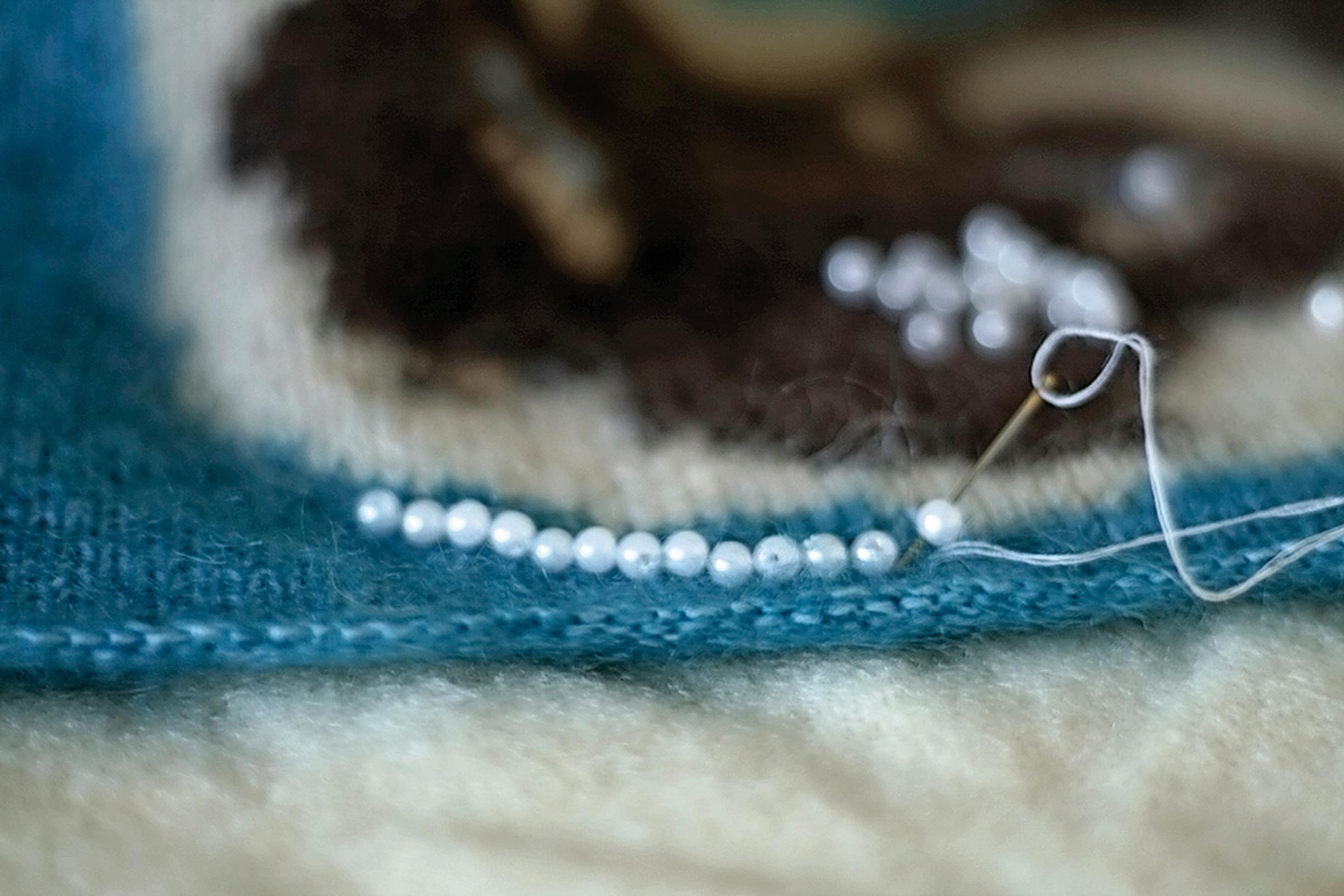 12. Kiinnitä helmiä tyttökissan kaulan alapuolelle. 13. Solmi tyttökissalle vaaleanpunainen rusetti ja kiinnitä se korvan juureen. Solmi poikakissalle vaaleansininen rusetti ja kiinnitä se pään alapuolelle.