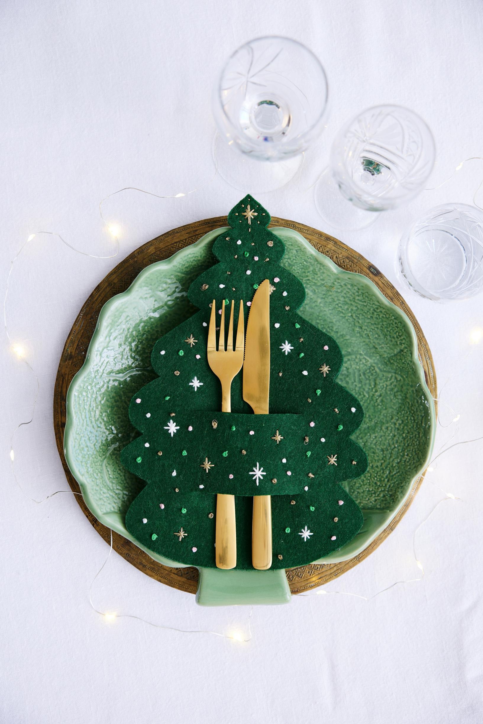 Tee suloinen aterintasku huovasta. Aseta aterimet huovan nurjalle puolelle ja piirrä niiden ympärille kuusi sekä sen alaosaan kaksi aterimille sopivan levyistä viiltokohtaa. Leikkaa kuusi ääriviivojen mukaan. Kirjaile erilaisin pistoin koristeita huopakuusen oikealle puolelle.