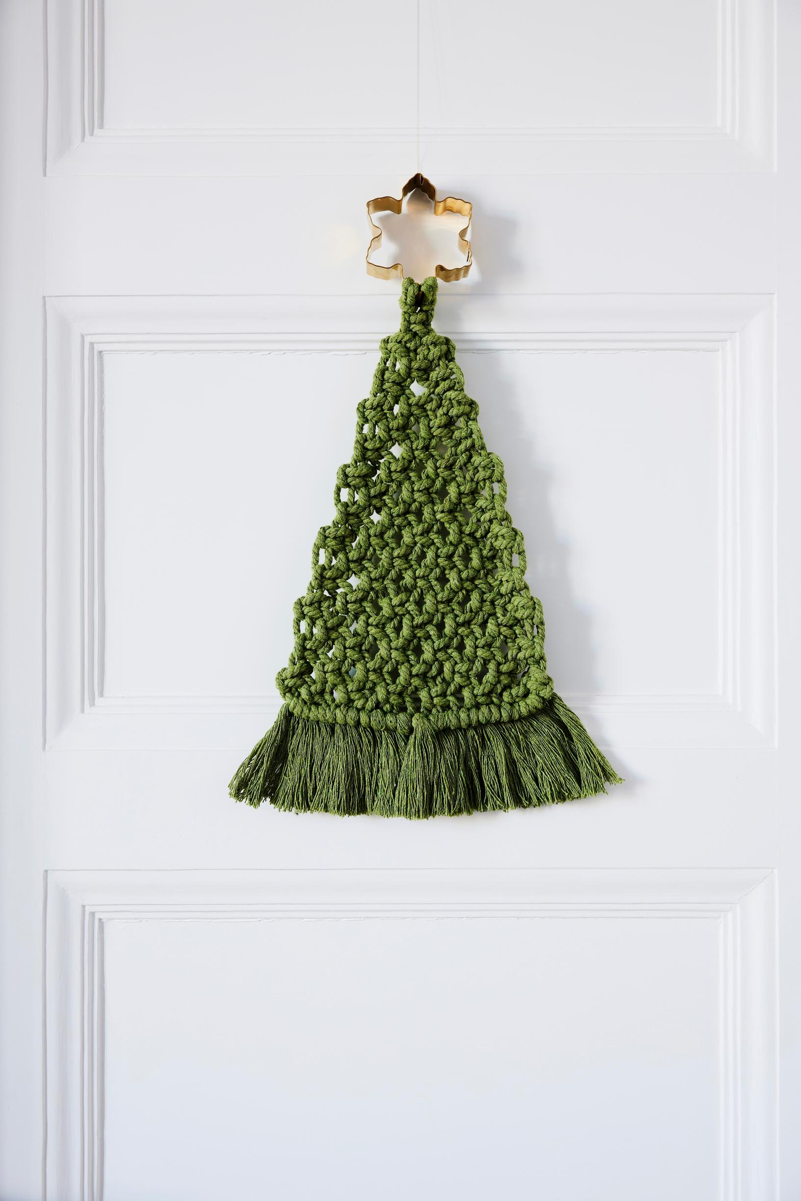 Solmeile makrameekuusi simppelein solmuin ulko-oveen tai seinälle. Voit käyttää mitä tahansa pyöreää lankaa, narua, kudetta tai nyöriä. Kuvan kuusi on 30 senttiä korkea. Ohjeen löydät meko.fi/makrameekuusi.