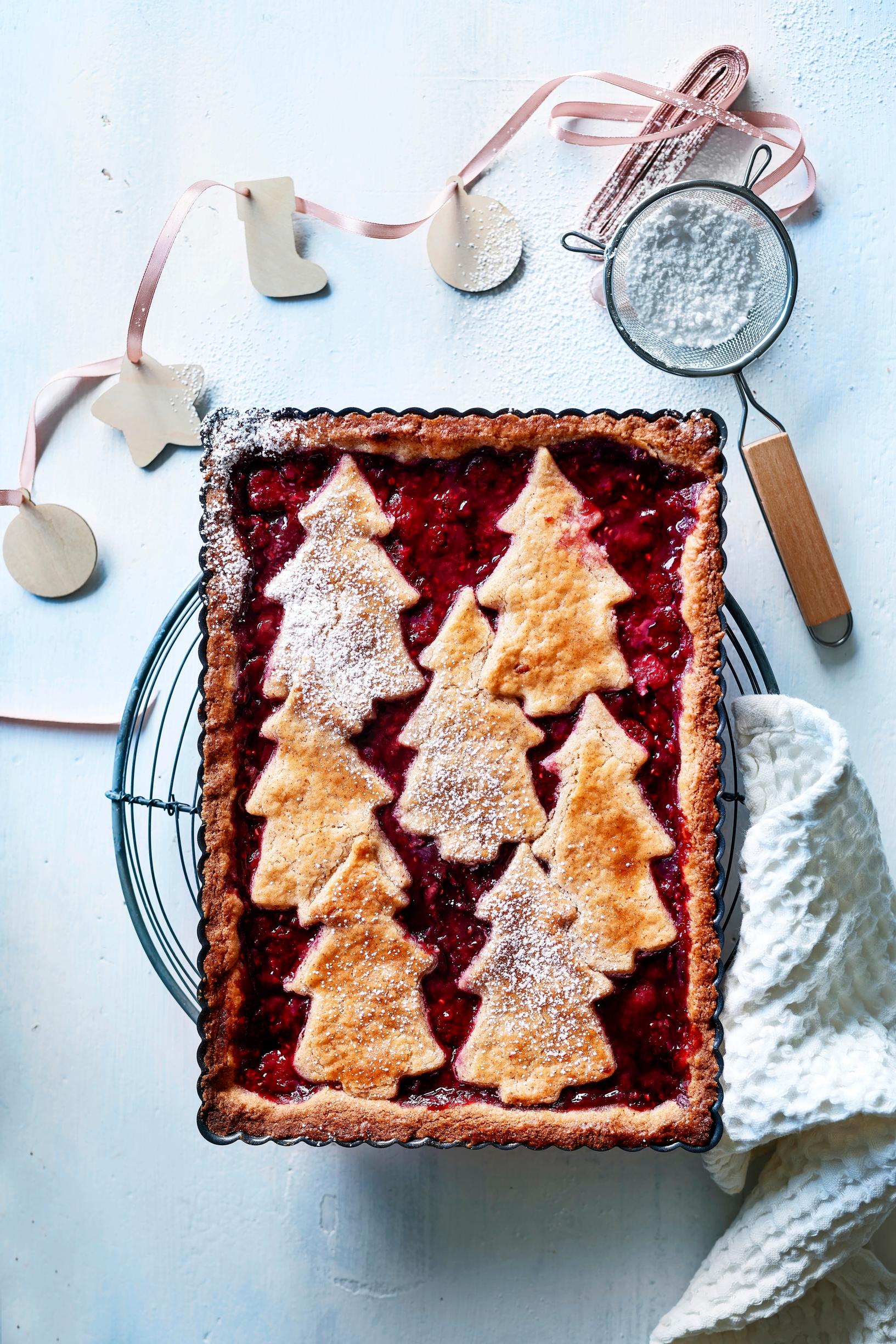 Jos piirakkatalkoissa jää ylimääräistä taikinaa, hyödynnä se piirakan koristelussa. Ota kuusimuotilla 7–8 kuusta, voitele ne valkuaisella ja asettele piirakan päälle. Viimeistele jäähtynyt piiras tomusokerilla.