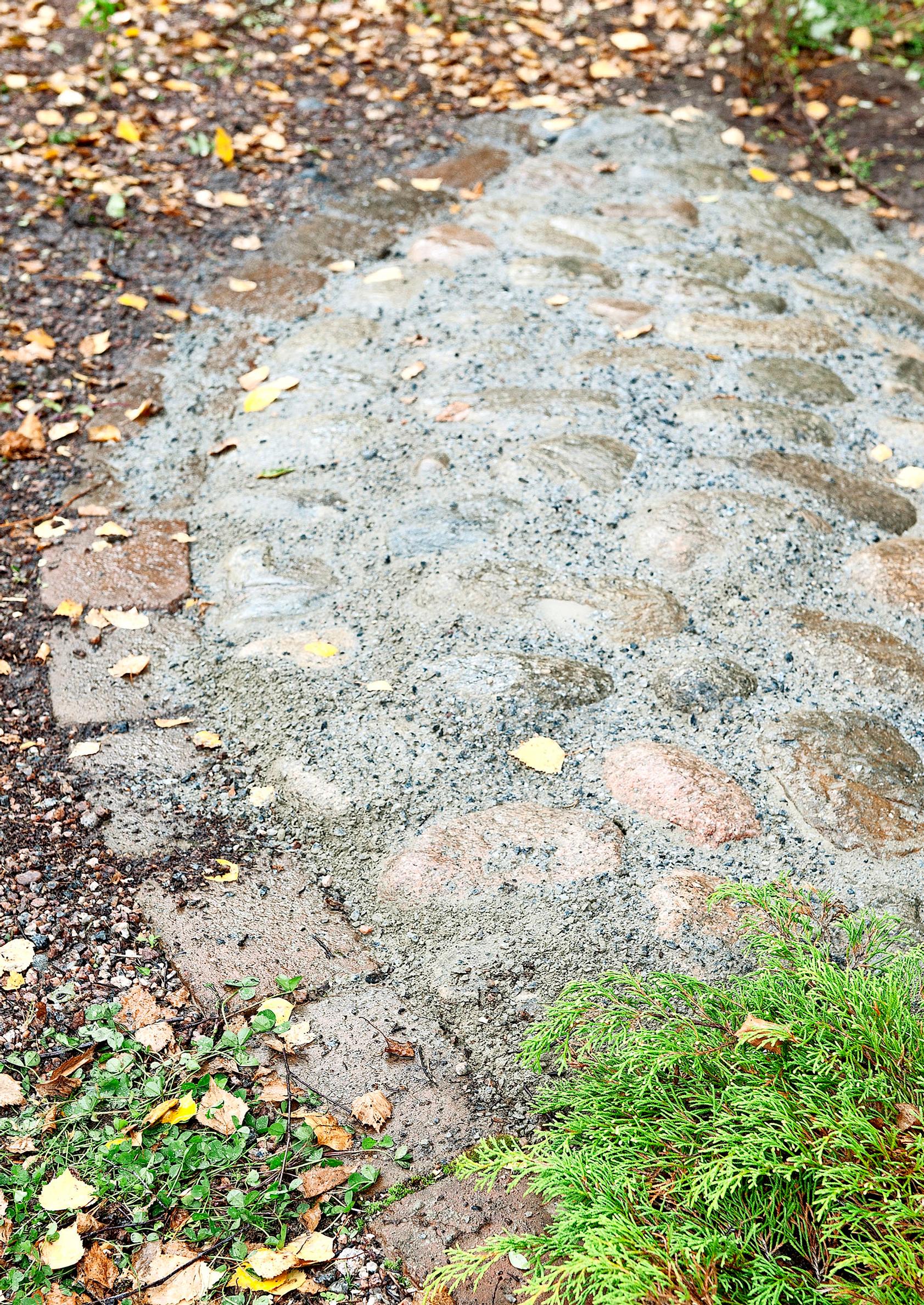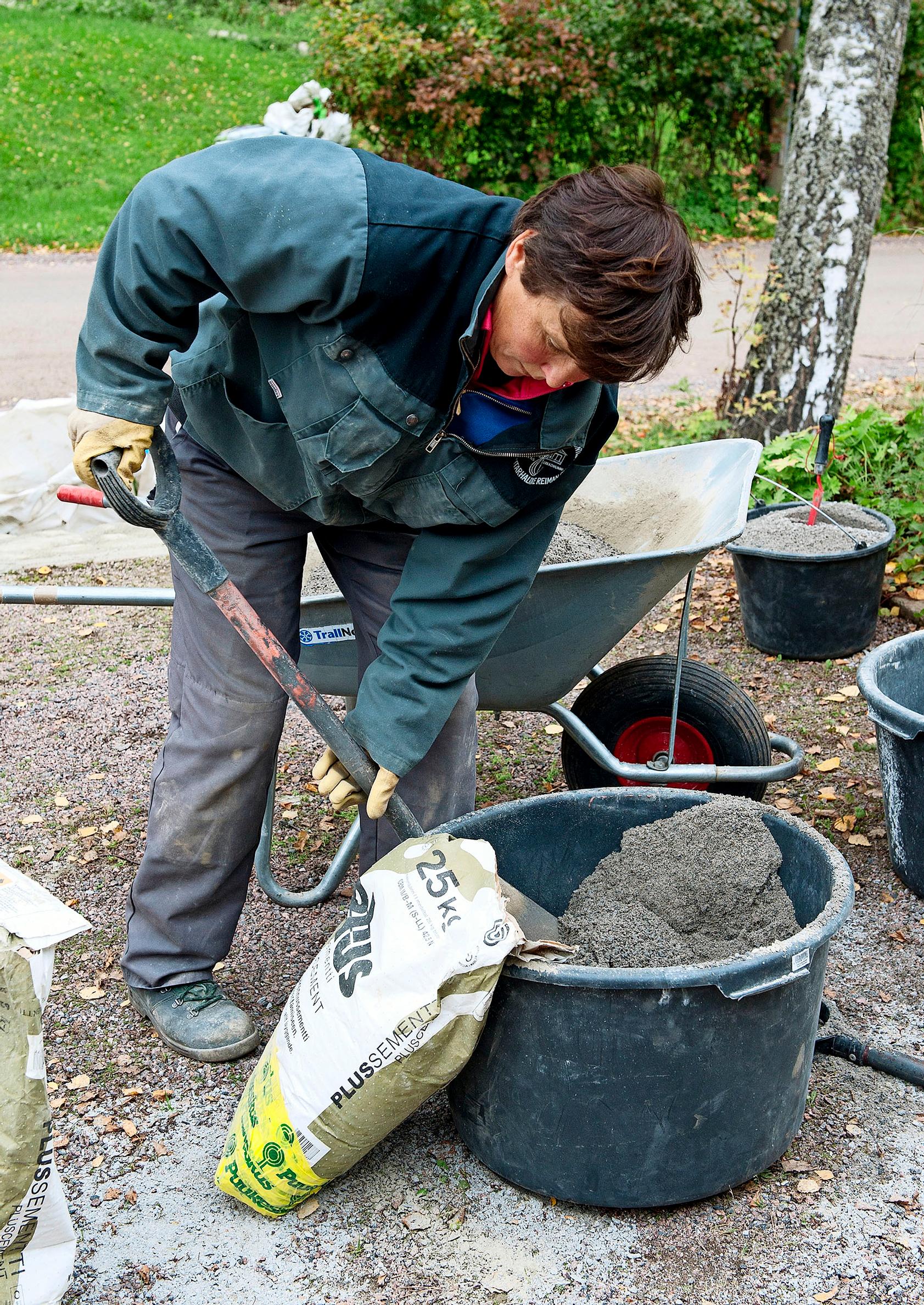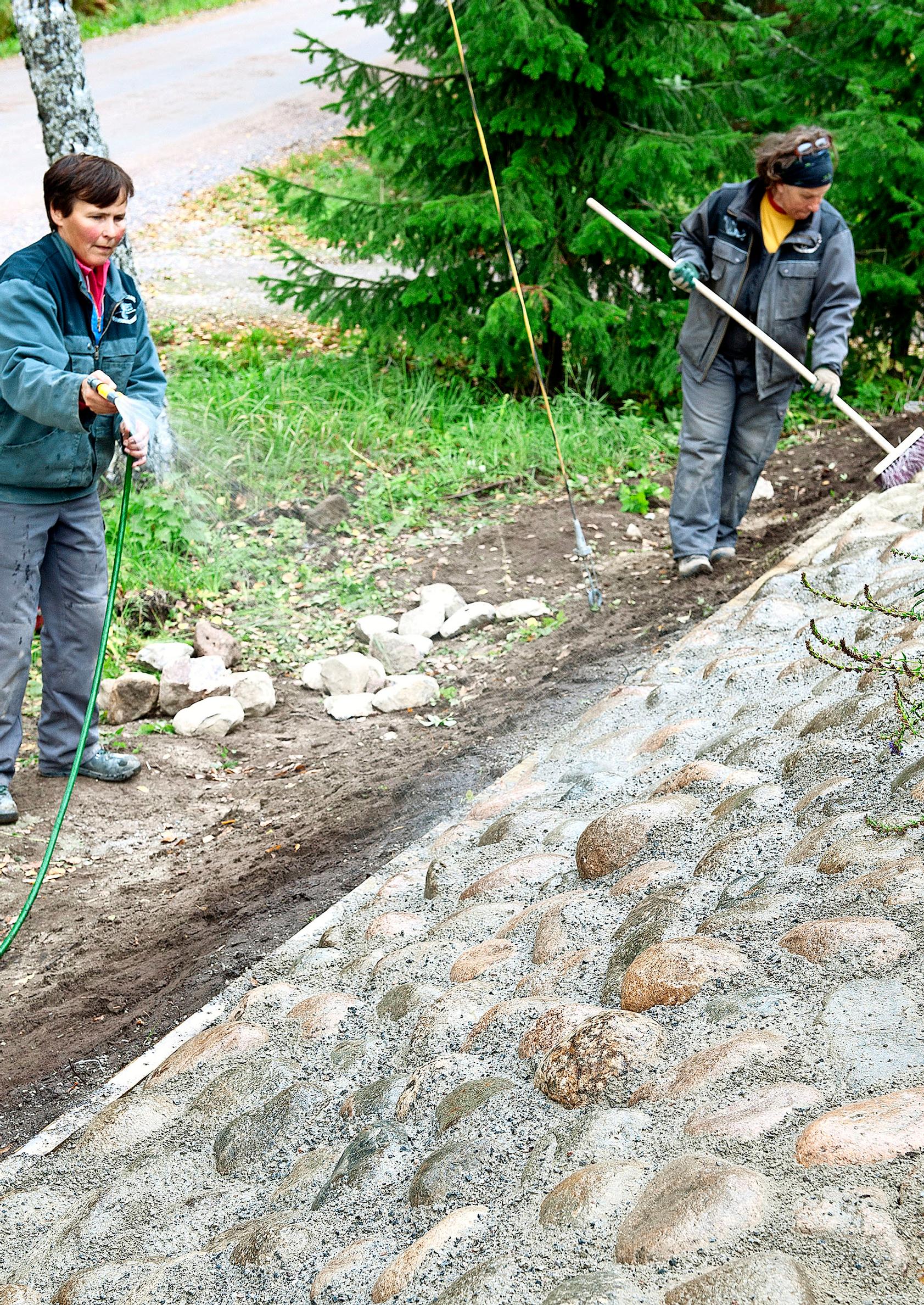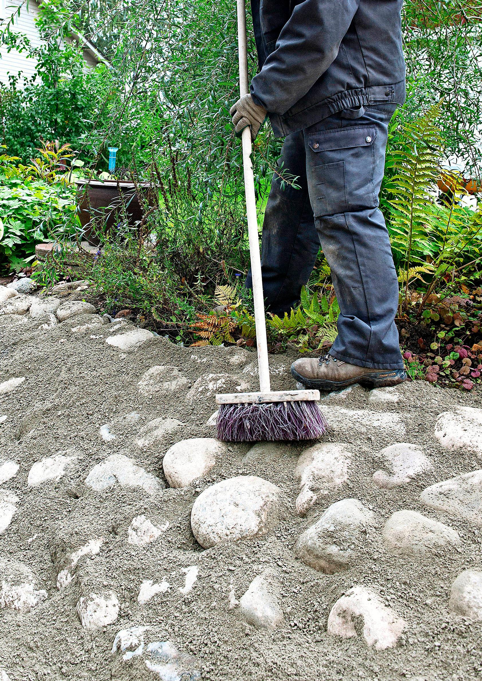 7. Harjaa kivet vielä katuharjalla, jotta seos painuu saumoihin tiiviisti. Harjaa saumoja eri suuntaan ja mahdollisimman tarkasti.
