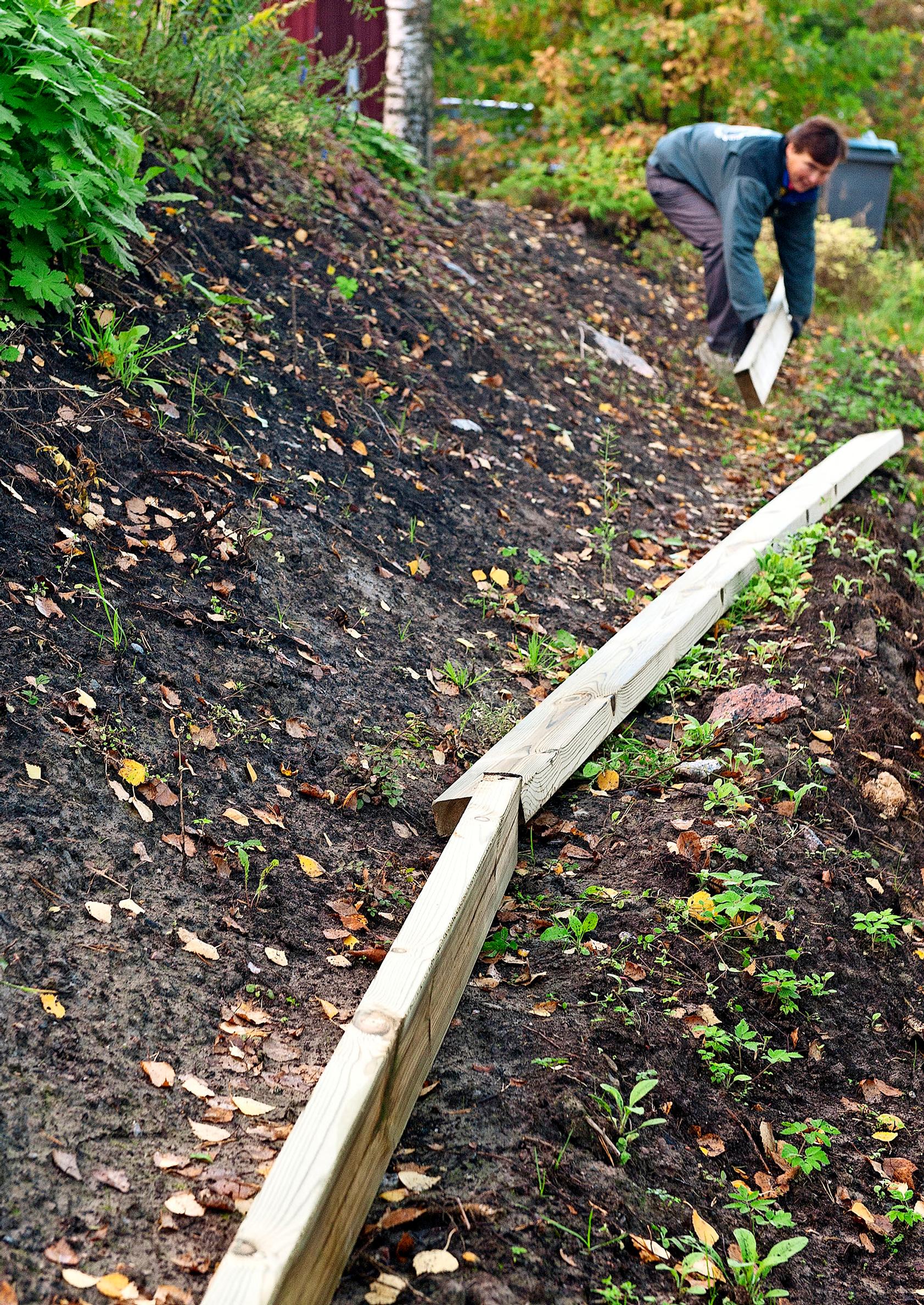 1. Rajaa rinne alaosastaan kestopuulaudalla, niin saat kiveyksen reunasta siistin ja tasaisen.